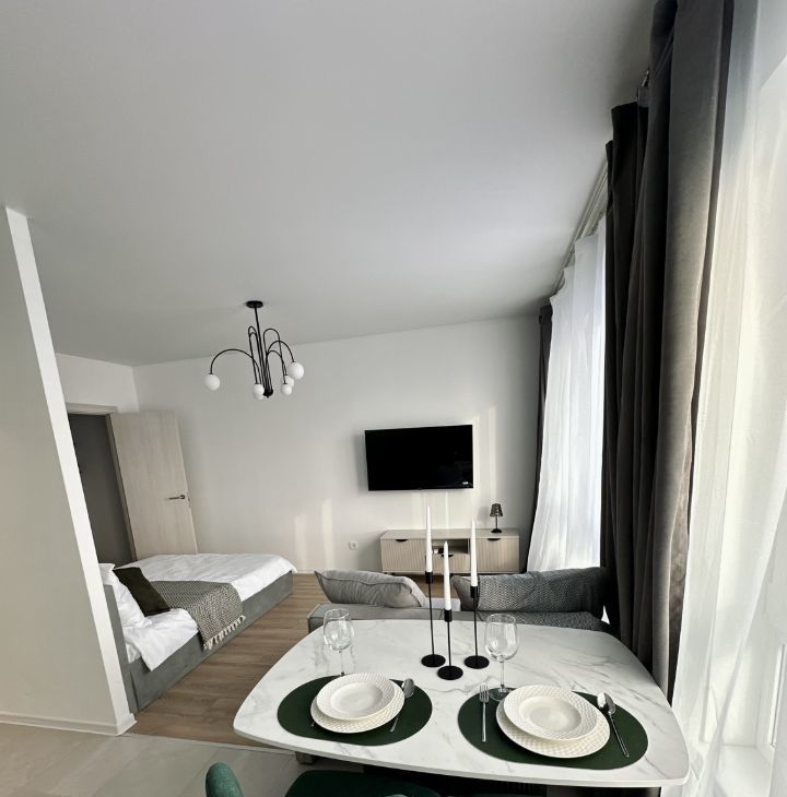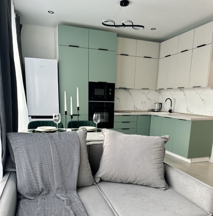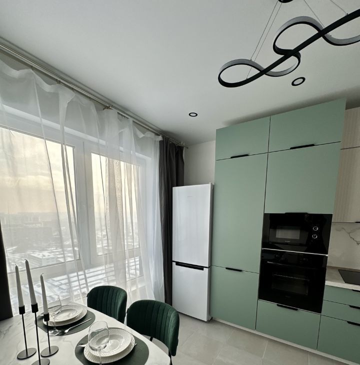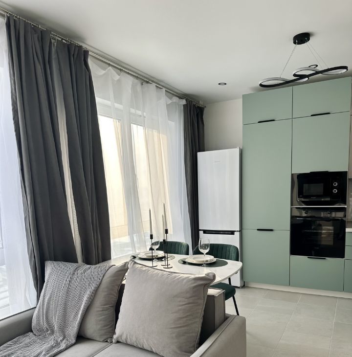 Установлена сплит-система, предусмотрена уютная ТВ-зона, мягкий раскладывающийся диван с полноценным спальным местом, большой обеденный стол. Имеется вся необходимая техника - индукционная плита, духовой шкаф, микроволновая печь, посудомоечная машина, холодильник.