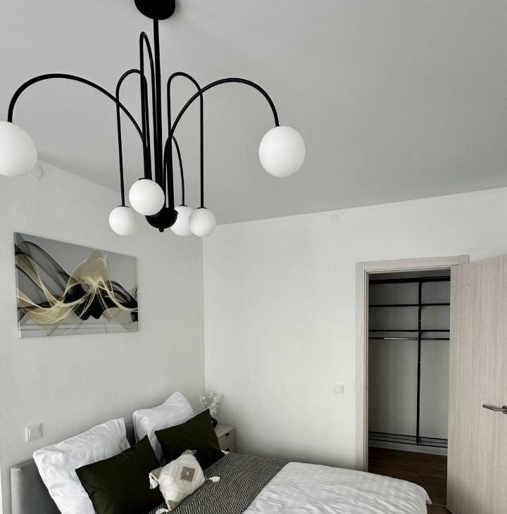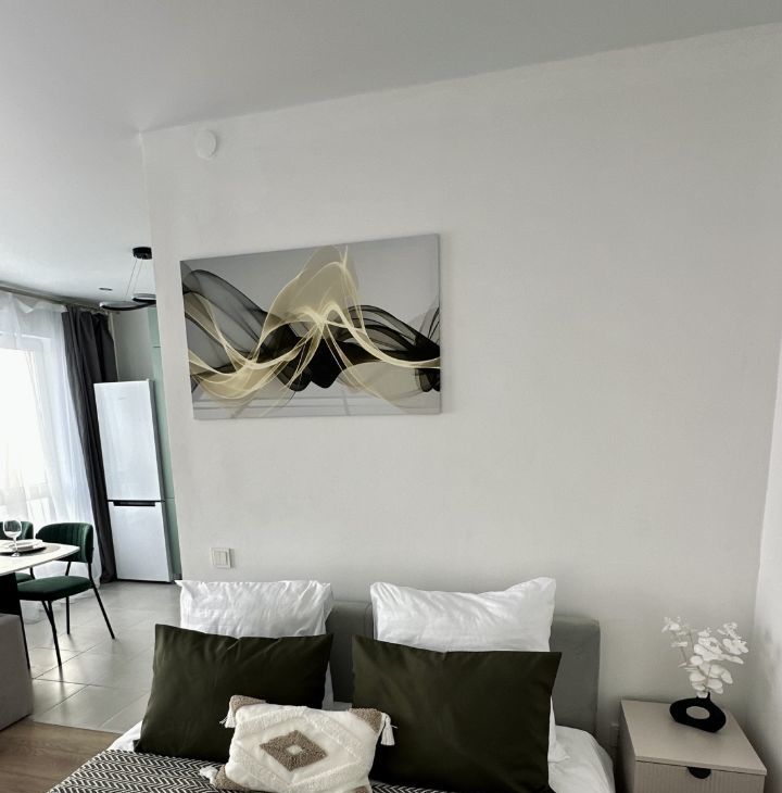 В спальной зоне большая кровать с подьемным механизмом и спальным местом 160*200, тумбочка. Окна занавешены легким тюлем, волшебно пропускающим дневной свет и плотными шторами, чтобы спастись от него в ранее утро)