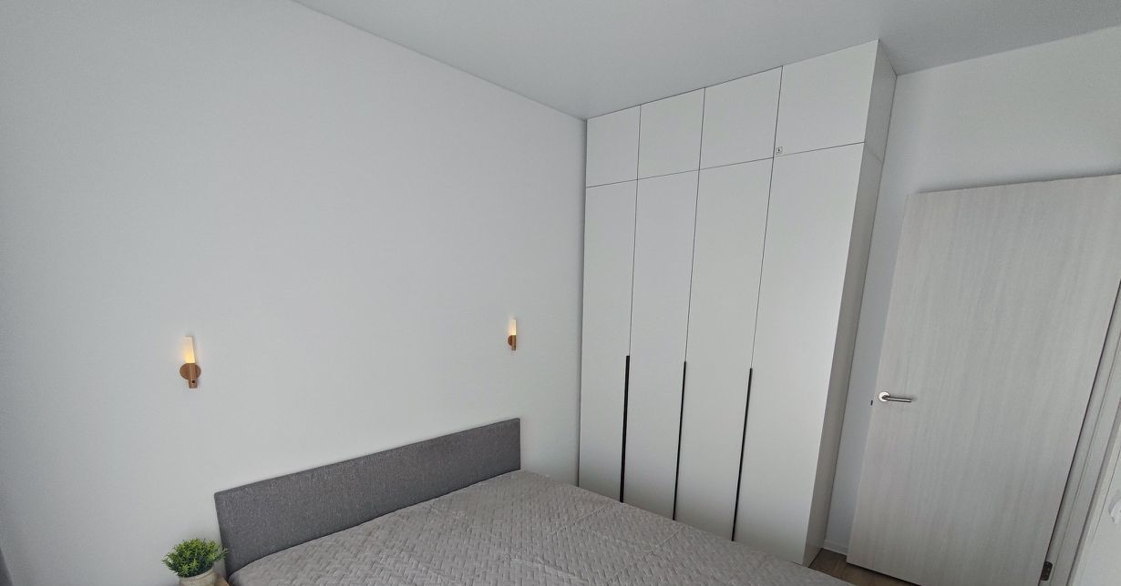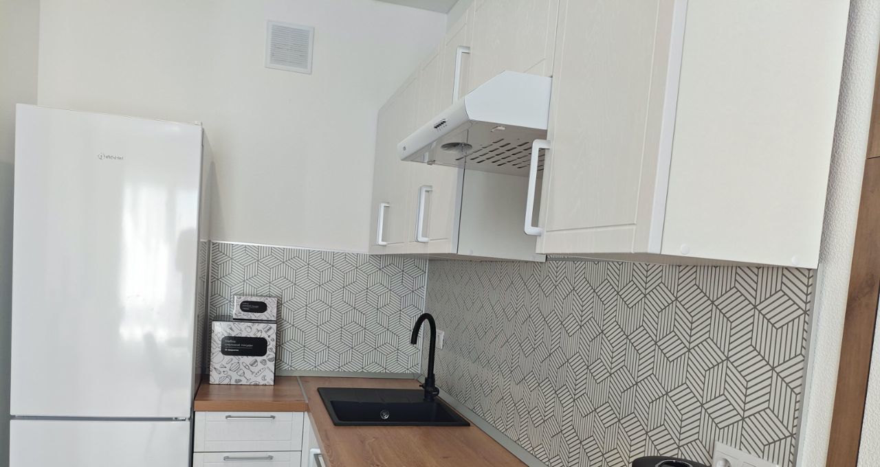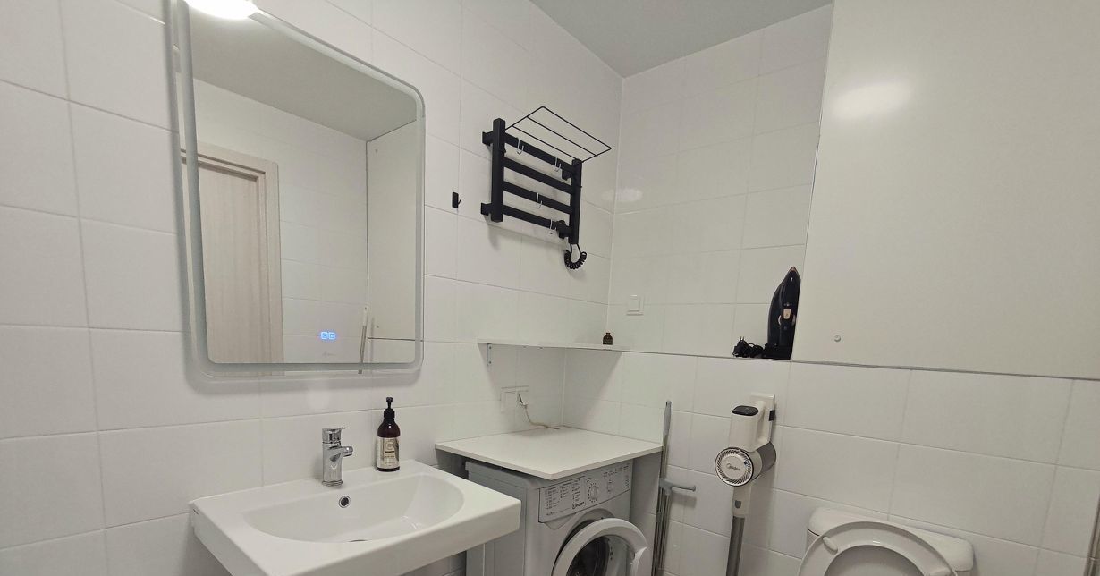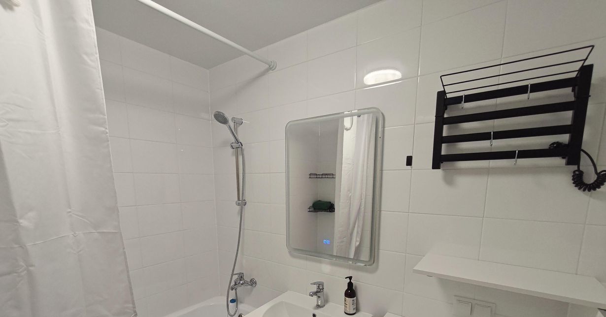Квартира полностью готова для комфортного проживания. В комнате и на кухне есть вся необходимая мебель. В ванной комнате установлена ванна, а также есть современная стиральная машина. На кухне вы найдете холодильник и всё необходимое для приготовления пищи.