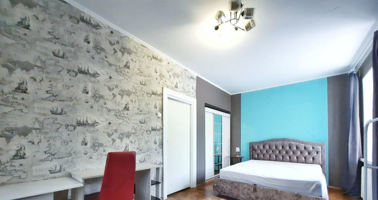 В комнате 2 окна, стоит двуспальная кровать, шкаф, стол компьютерный, кресло, имеется выход на балкон. Кухонный гарнитур с варочной панелью, холодильник, микроволновка и стиральная машинка.