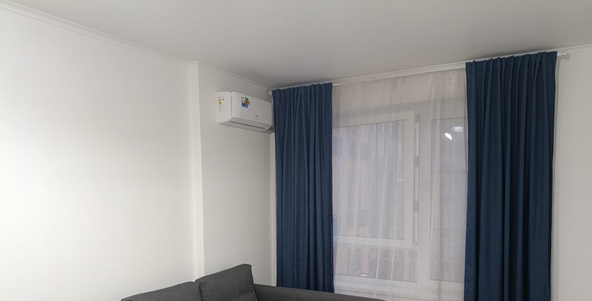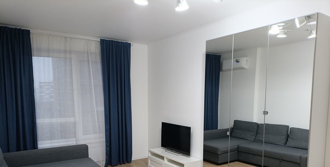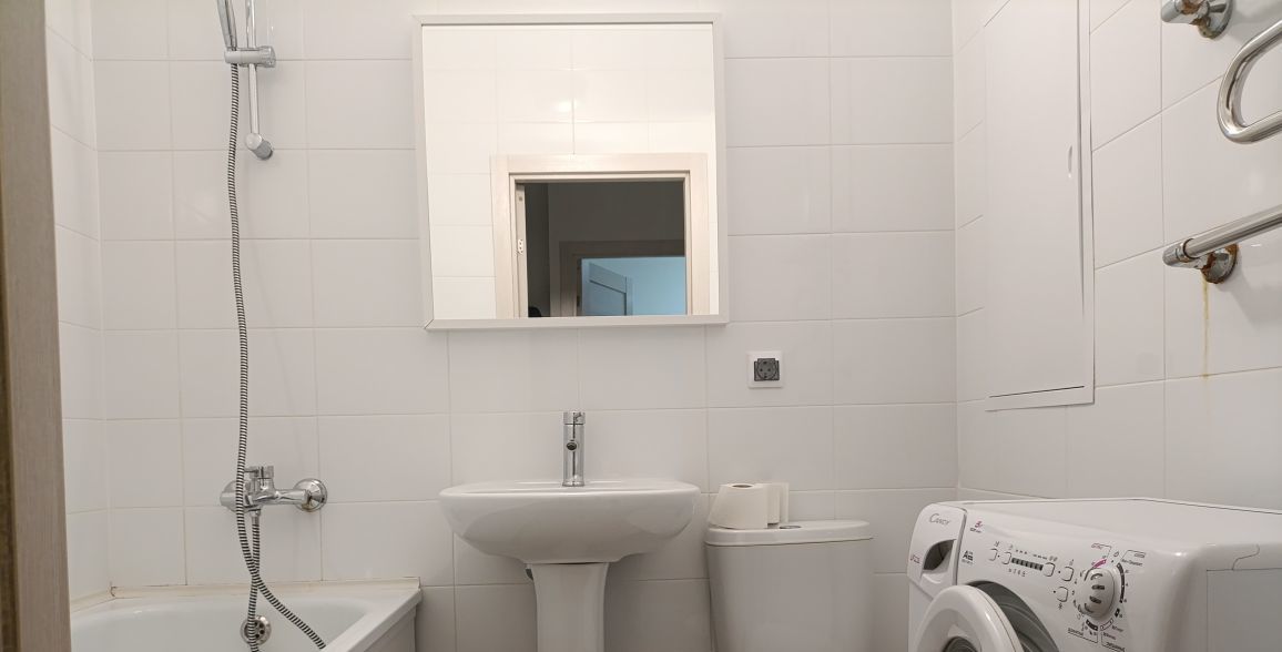 Квартира полностью меблирована и готова к проживанию: в комнате и на кухне есть необходимая мебель. На кухне вы найдёте посудомоечную машину, холодильник и все необходимые принадлежности. В комнате установлен кондиционер, а также есть телевизор. В ванной комнате вас порадует удобная ванна. Для вашего удобства есть стиральная машина. Квартира оснащена интернетом.