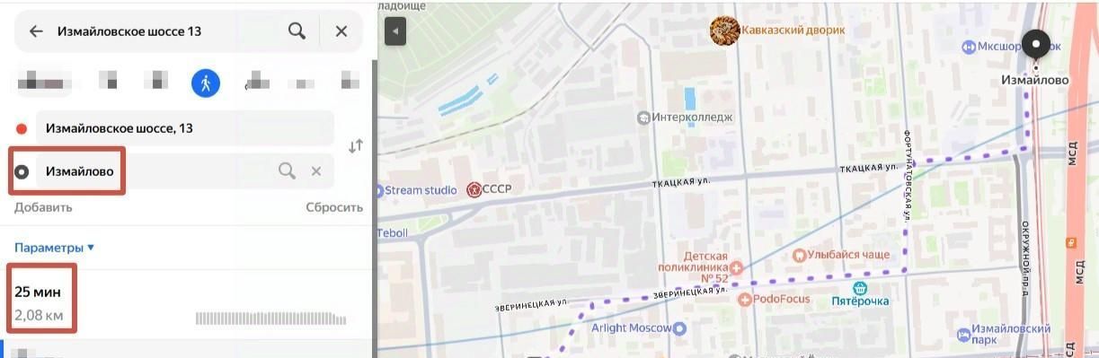 ст. М4 Измайлово Московское центральное кольцо 25 минут пешком (см.фото).