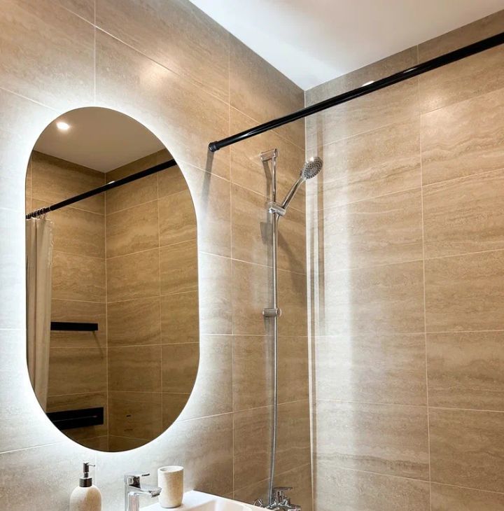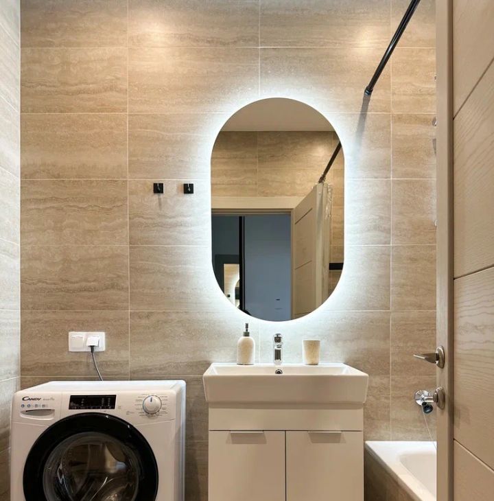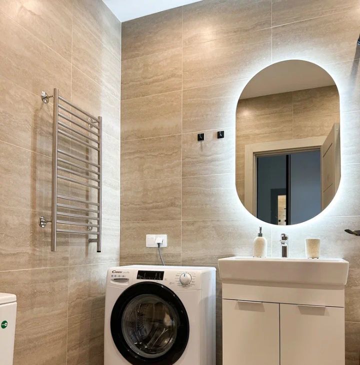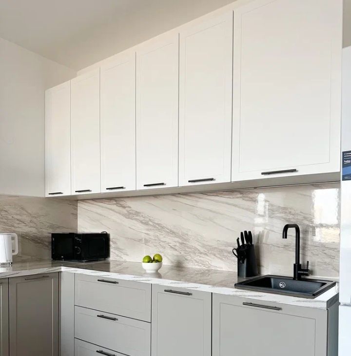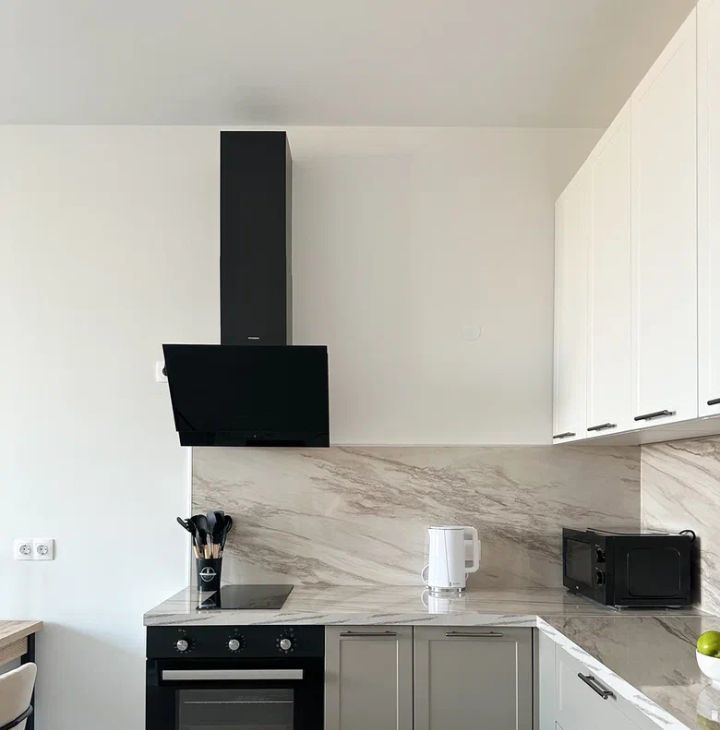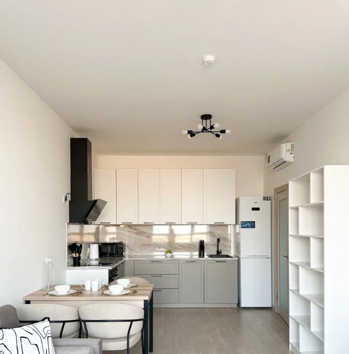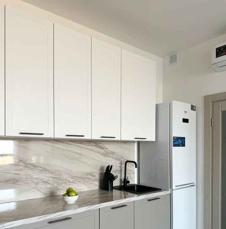 Бытовая техника: холодильник, варочная панель, духовой шкаф, электрический чайник, утюг, микроволновая печь, стиральная машина, посудомоечная машина, кондиционер.