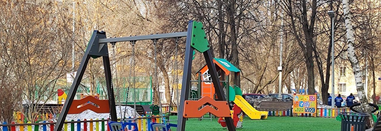 Закрытый двор с детской площадкой и парковкой под шлагбаумом (машина в безопасности).