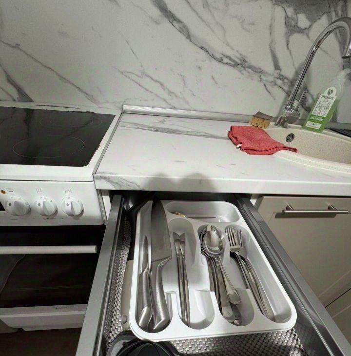 В квартире имеется вся необходимая мебель и техника, в том числе набор посуды и кухонных принадлежностей.