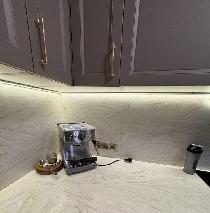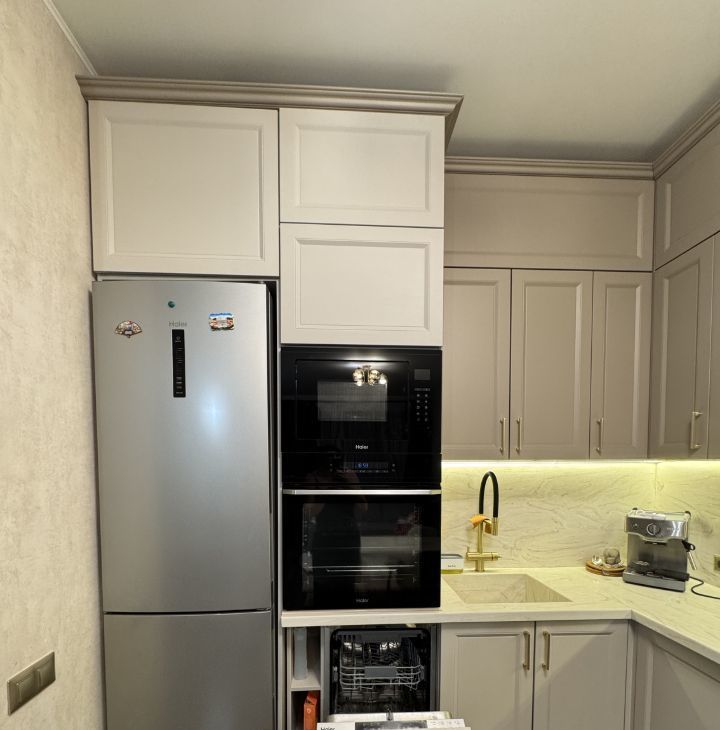 Кухня-мечта для ценителей: Современный гарнитур с практичной столешницей из акрилового камня. Вся новая техника уже встроена: