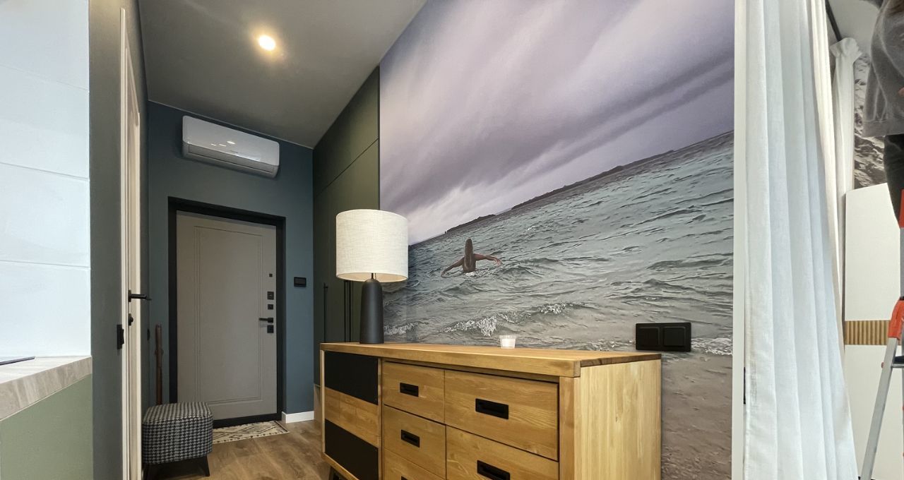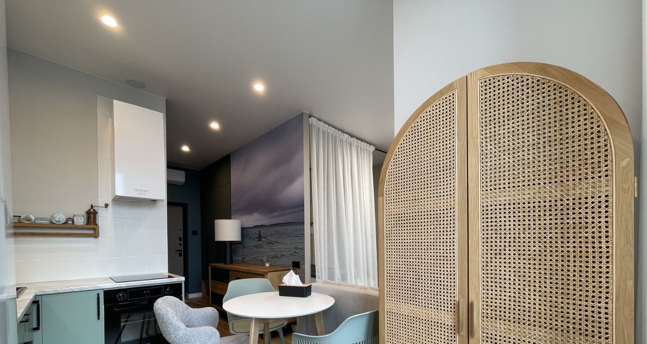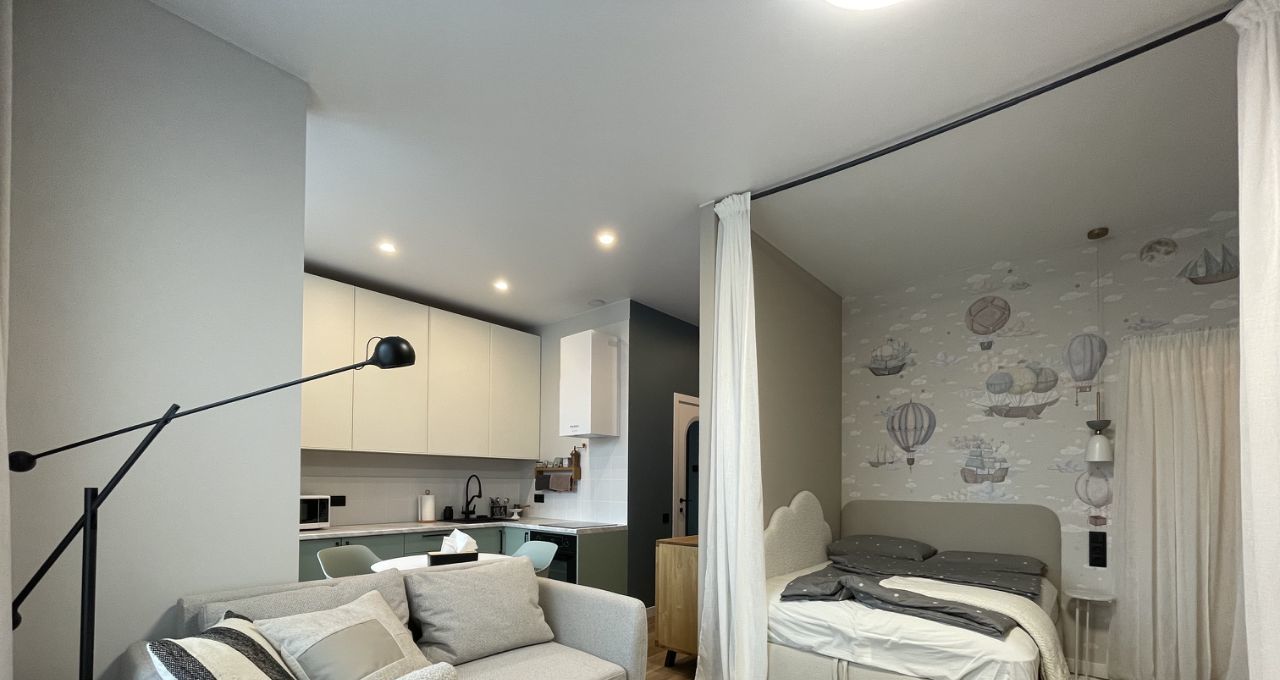 Площадь: 35,2 м2 (комната — 20 м2 (разделённая на спальню, гардеробную и зону гостинной, кухня — 8 м2).