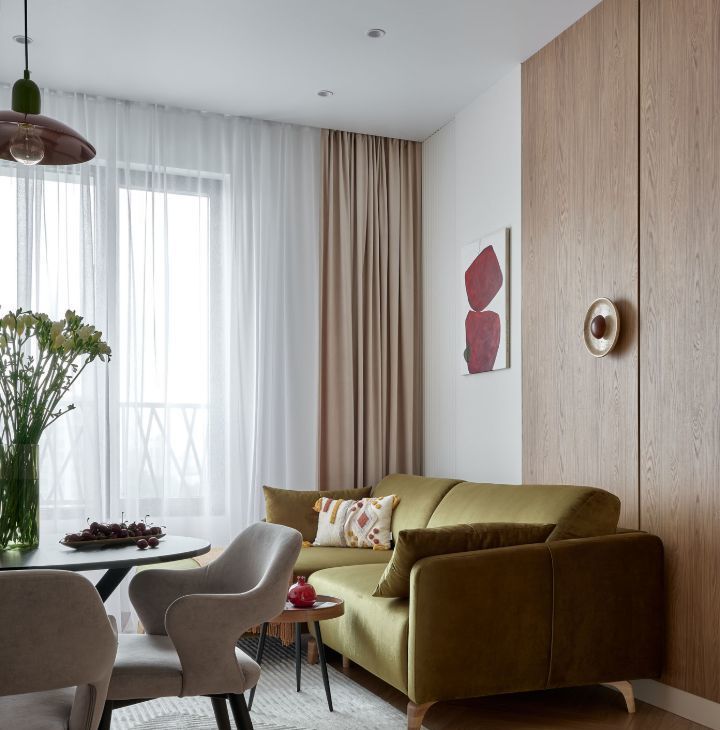 - гостиная с большим комфортным диваном и декоративными деревянными панелями, которые создают глубину и визуальное тепло пространства