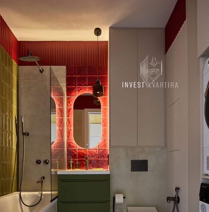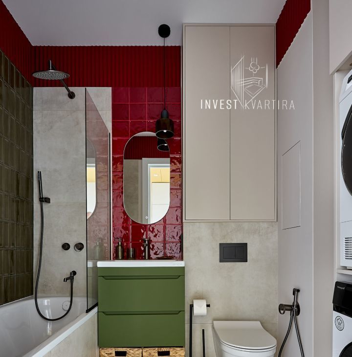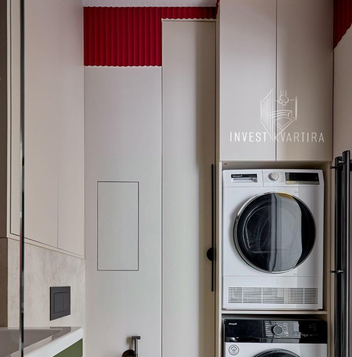 - акцентная ванная комната, оборудованная стиральной и сушильной машинами, а также продуманными местами для хранения и вертикального пылесоса.