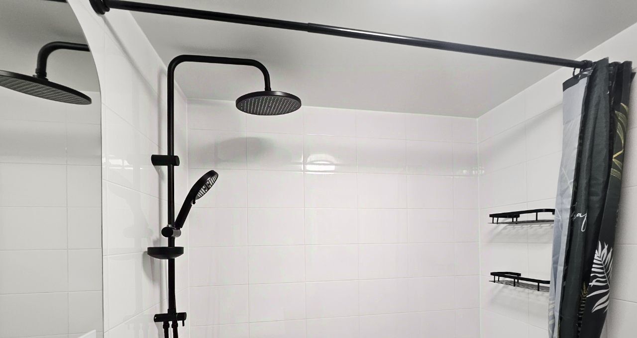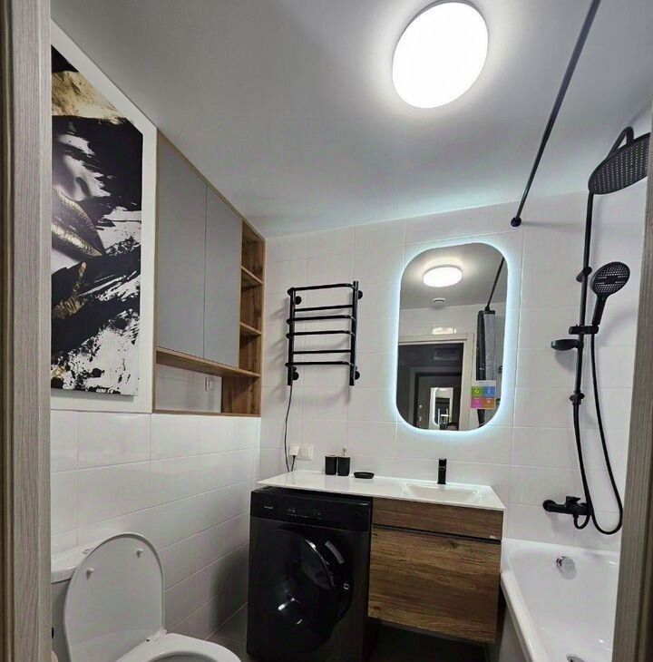 Санузел совмещенный (3,6кв.м) укомплектован стирально-сушильной машиной, душевой системой с тропическим душем, качественными черными смесителями.