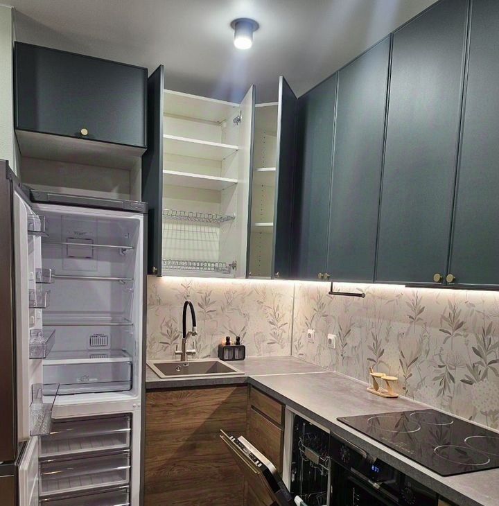 В кухне-гостиной современный кухонный гарнитур, посудомоечная машина, большой холодильник, стеклокерамическая варочная поверхность на четыре конфорки, духовка. Также есть полноценный обеденный раскладной стол, двуспальный диван, компьютерный стол. Все расположено удобно и грамотно, достаточно свободного пространства и света!