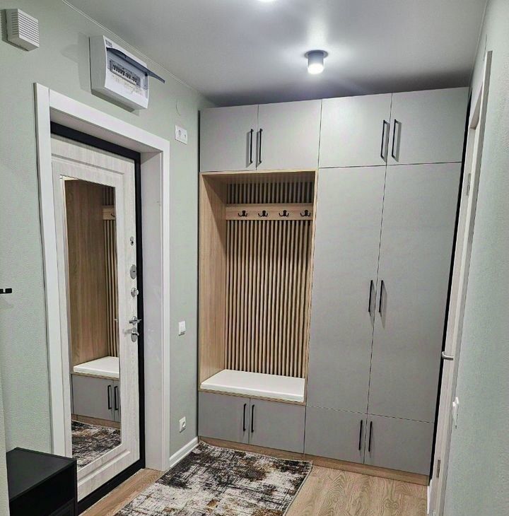 В коридоре, также вместительный шкаф, качественная надежная входная дверь с зеркалом с хорошей шумоизоляцией.