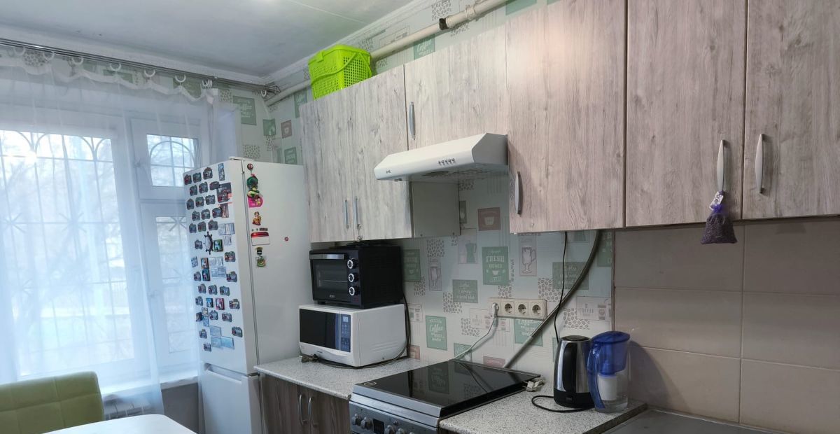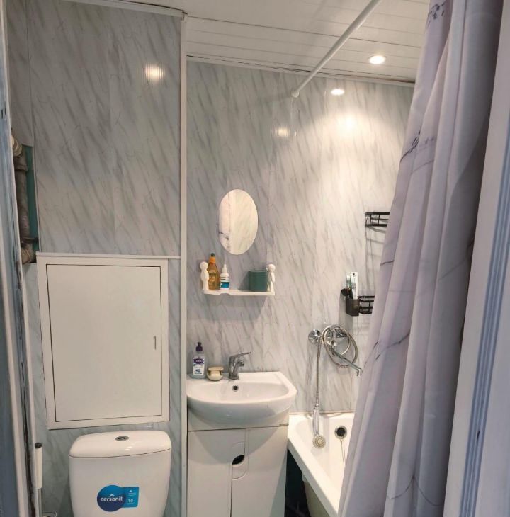В квартире сделан косметический ремонт, поэтому она выглядит свежо и аккуратно. Просторная комната обставлена необходимой мебелью. На кухне также есть вся нужная мебель и техника: кондиционер, холодильник и стиральная машина. Санузел совмещённый, в ванной комнате установлена ванна. Окна выходят во двор, поэтому в квартире тихо и спокойно.