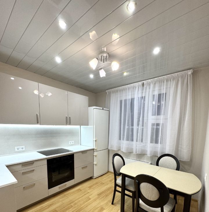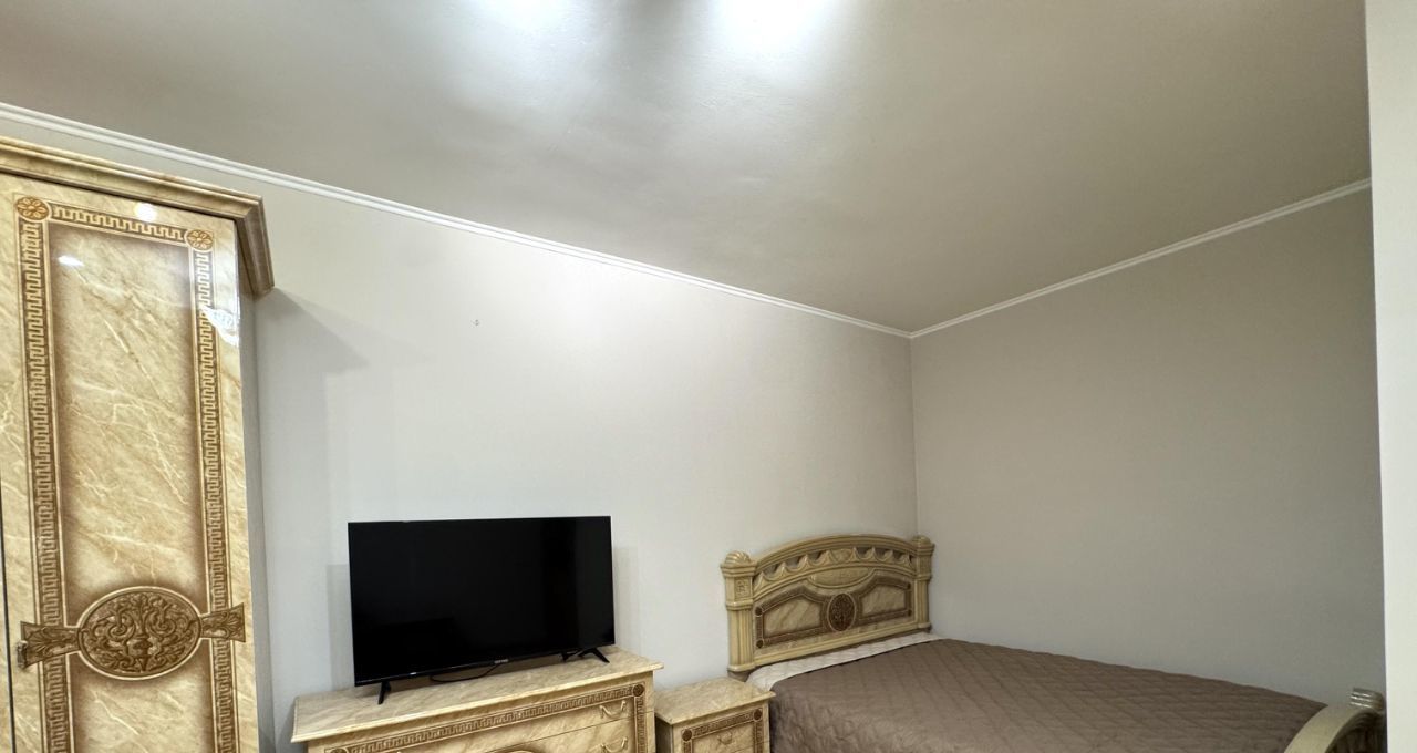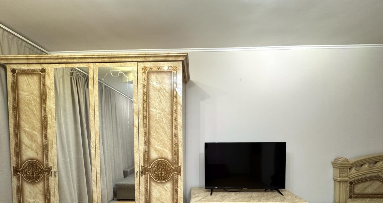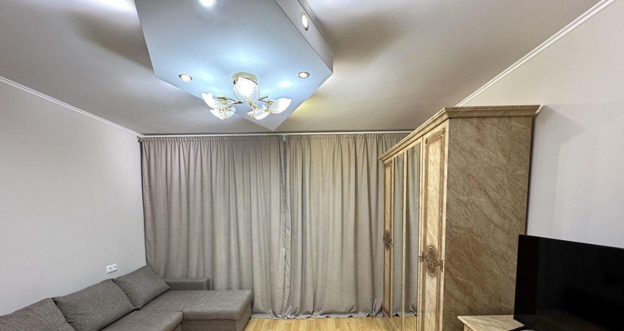 В квартире выполнен евро ремонт. Просторная кухня оборудована всем необходимым: холодильник, варочная панель, духовой шкаф. В гостиной установлен большой угловой диван и телевизор. Из мебели также имеются вместительные шкафы, комод и кровать.