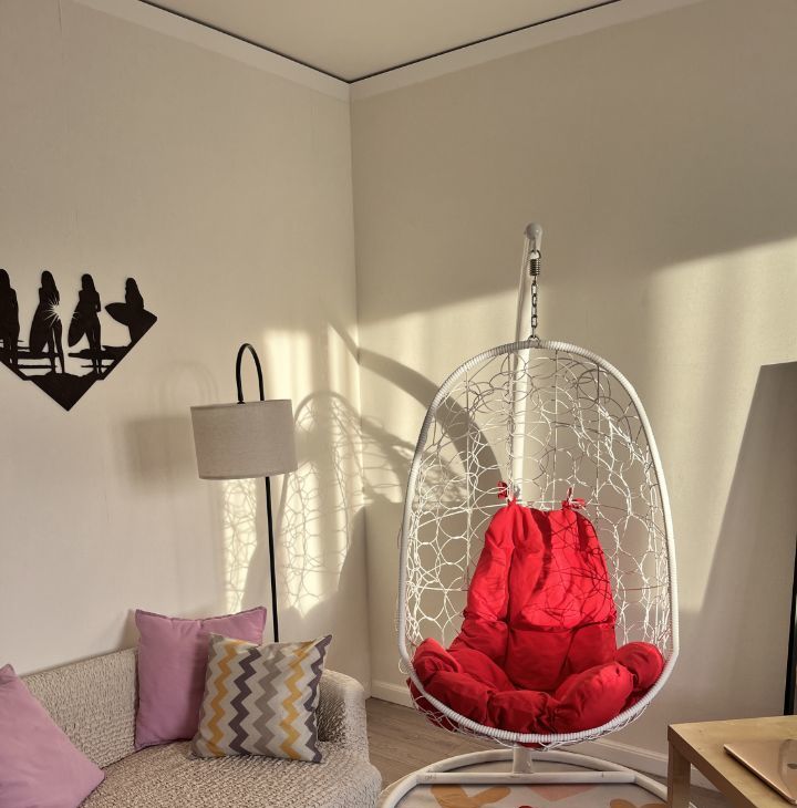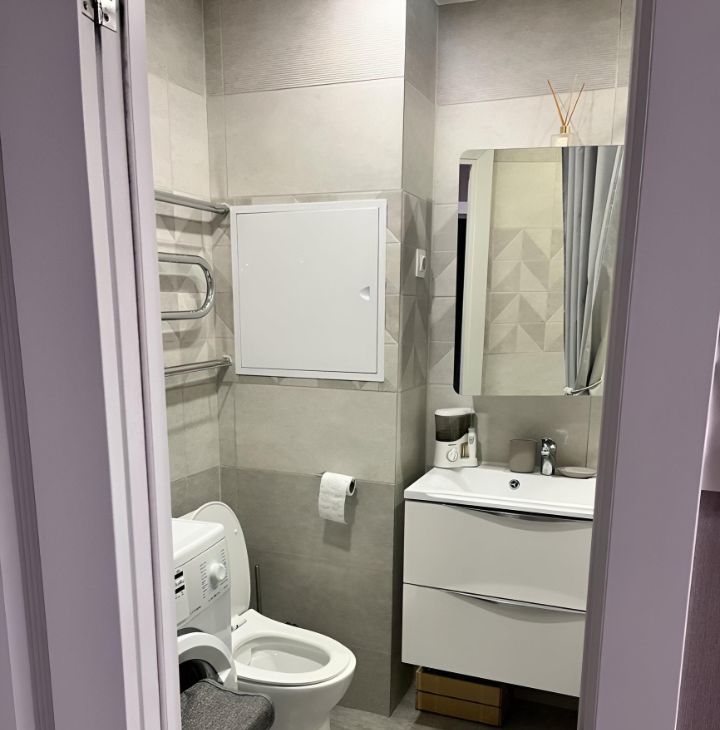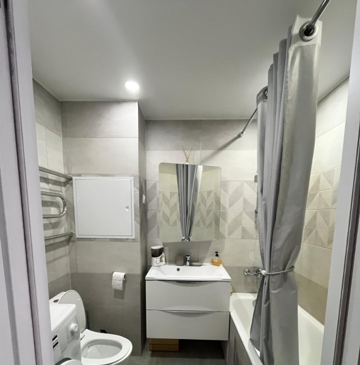 В квартире сделан современный евроремонт. Комната и кухня полностью меблированы, поэтому можно сразу заехать и жить с комфортом. Из техники в наличии: кондиционер, холодильник, телевизор и стиральная машина, пылесос, кофемашина и др. В комнате также есть кресло-качели. Санузел совмещенный, с ванной. Также есть застекленный балкон.