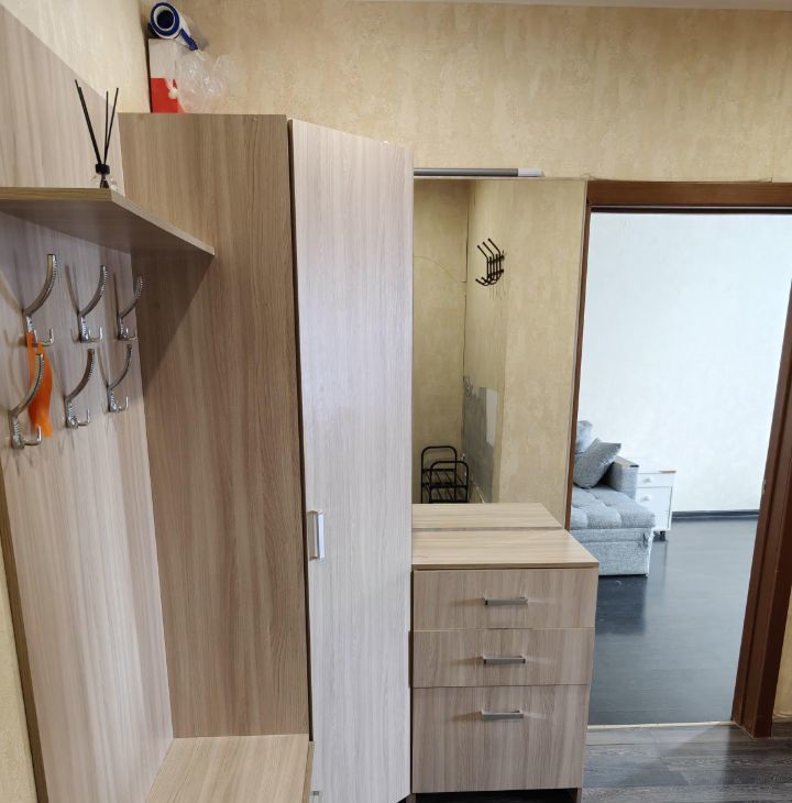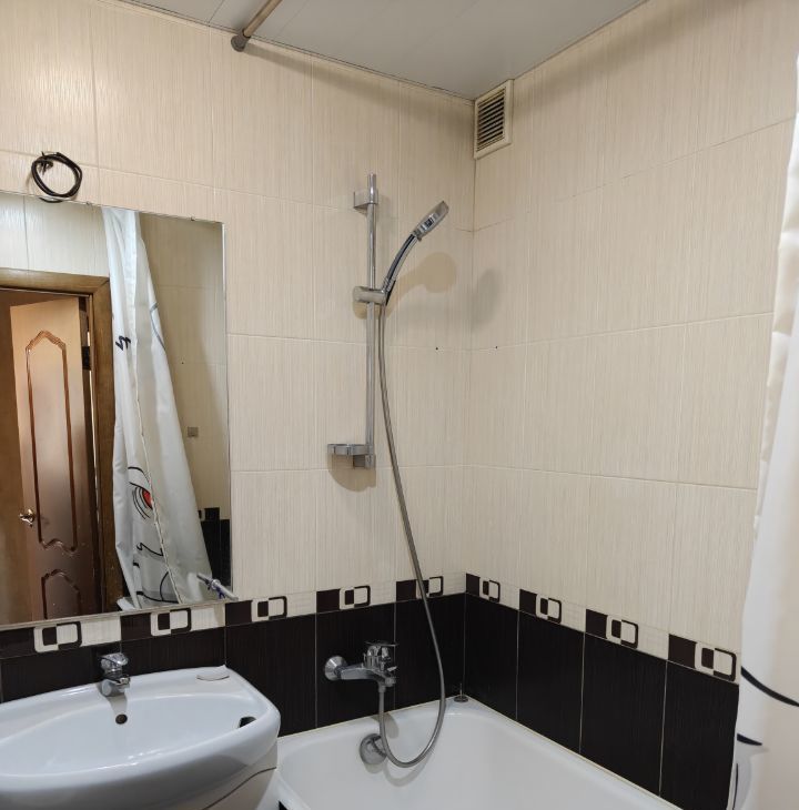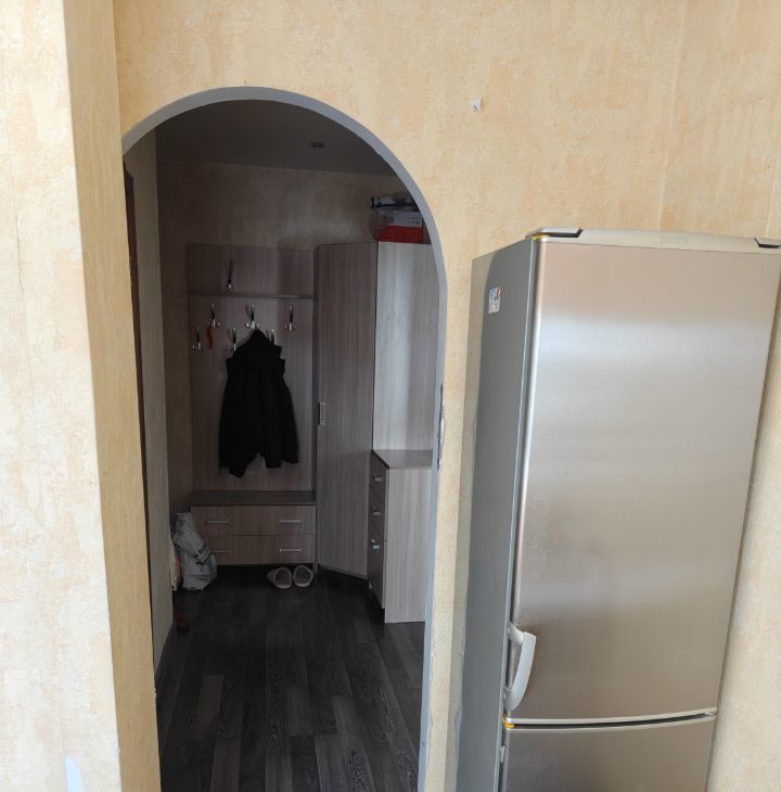 В квартире сделан косметический ремонт. Здесь есть все необходимое для комфортного проживания: мебель в комнате и на кухне, холодильник и стиральная машина. Санузел совмещенный, оснащен ванной. Также имеется балкон, где можно отдохнуть или обустроить зону для хранения. Дом оборудован пассажирским и грузовым лифтами, есть мусоропровод.