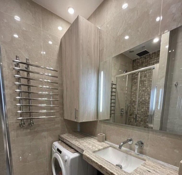 Стиральная машина с сушилкой и полотенцесушитель. Туалет с встроеным бачком и возможностью установки крышки-биде. И ванная и туалет имеют мощные вытяжки для снижения влажности и удаления запахов.