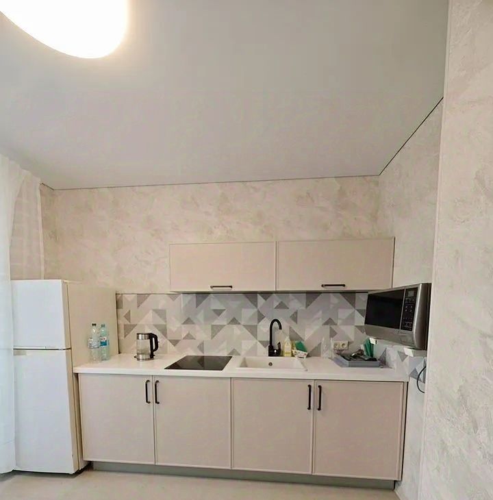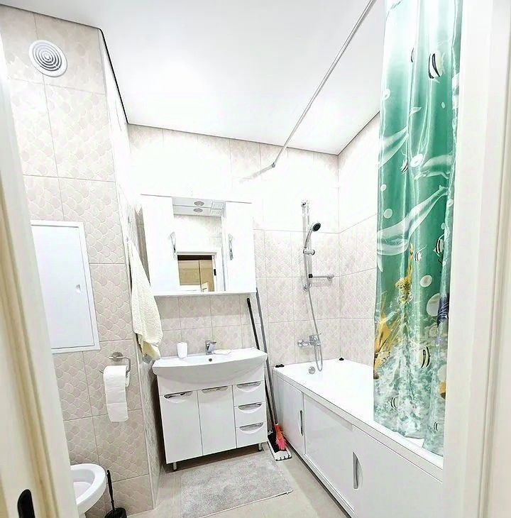 В квартире сделан качественный евроремонт. Просторная комната обставлена современной мебелью. Кухня оборудована всем необходимым: холодильником, телевизором и стиральной машиной. Есть кондиционер для комфортного проживания. Санузел совмещенный, с ванной. Окна выходят во двор, что обеспечивает тишину и уют. Также имеется балкон.