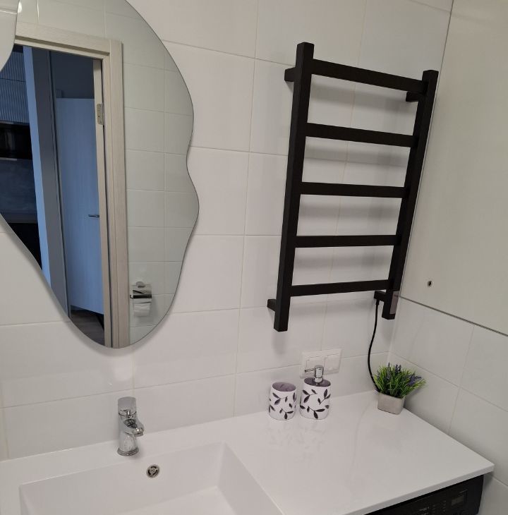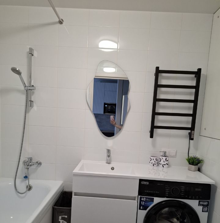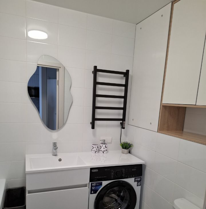 В ванной комнате установлен вместительный шкаф, зеркало с подсветкой, полотенцесушитель, стиральная машина, тумба со столешницей, бельевая корзина.