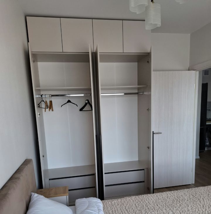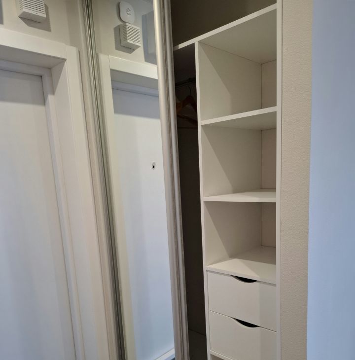 В спальне кровать с подъемным механизмом (много места для хранения), высокий ортопедический матрас Аскона, удобный шкаф для двоих с выдвижными ящиками, шторы блэкаут. Созданы все условия для Вашего сладкого сна.