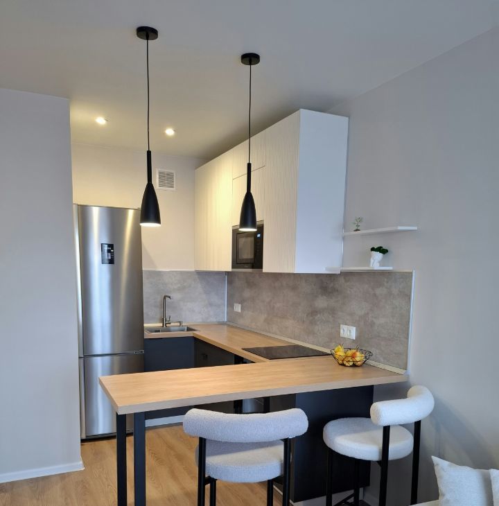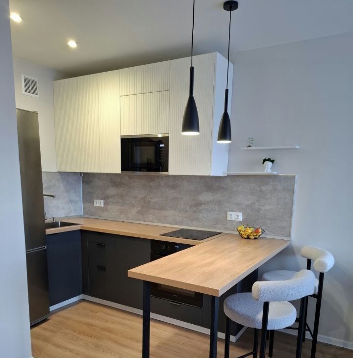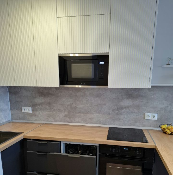 Кухня оснащена всей необходимой бытовой техникой (эл плита, микроволновка, посудомойка, духовой шкаф с функцией гриля и конвекцией, холодильник не требующий разморозки), имеет просторную рабочую зону с подсветкой.