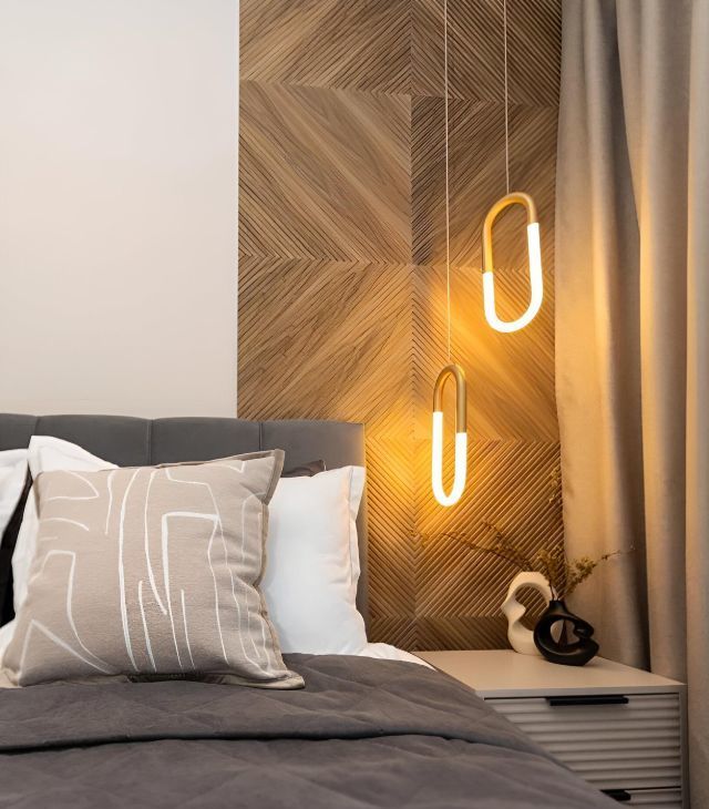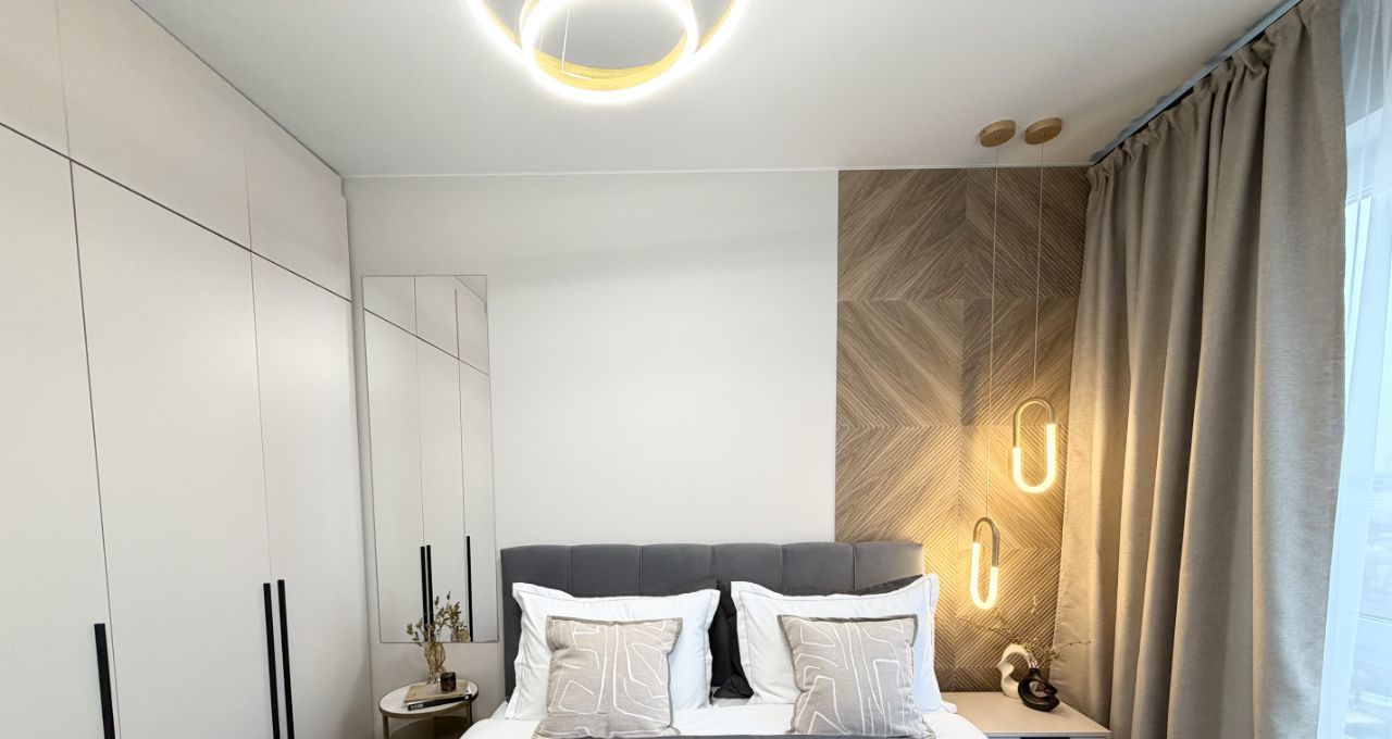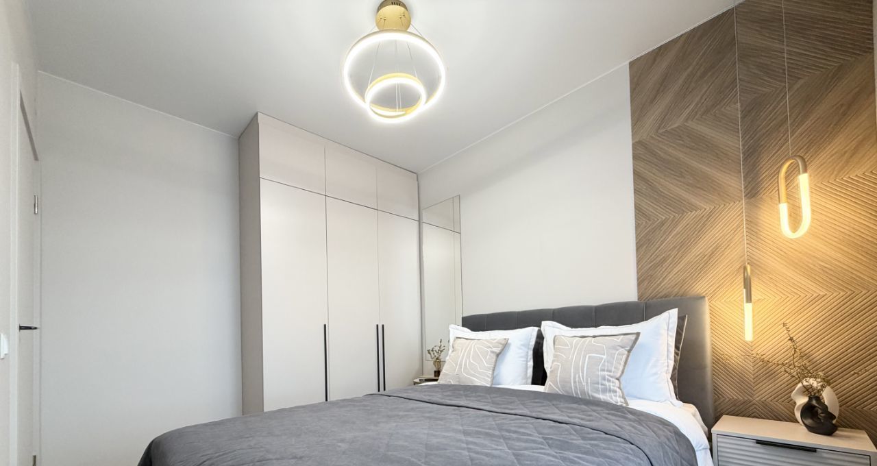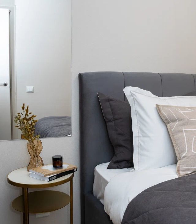 Спальня 9 кв м: двуспальная кровать с ортопедическим матрасом, прикроватная тумбочка, функциональный трехстворчатый шкаф, зеркало.