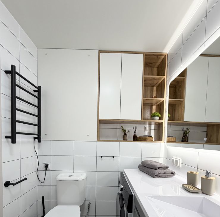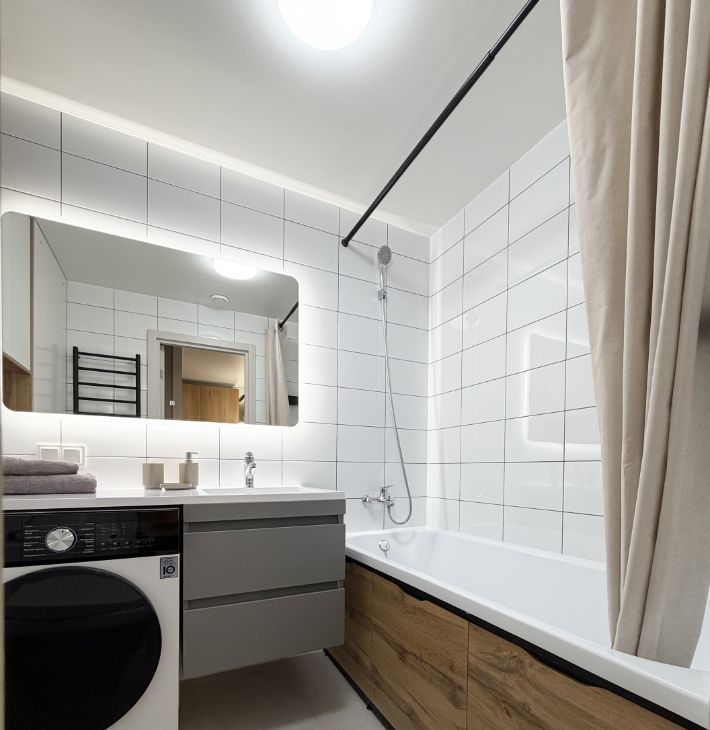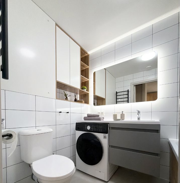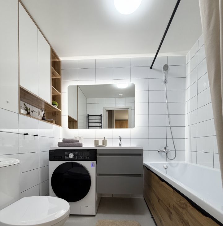 Совмещённый санузел. Ванная: ванна, шкаф навесной, стиральная машина Weissgauff, полотенцесушитель.