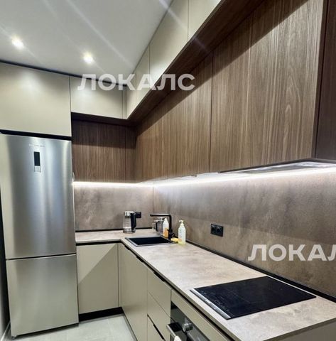 В квартире встроенная кухня с большим количеством шкафов для хранения, индукционная варочная панель, посудомоечная машина, вытяжка, холодильник с функцией No Frost, кондиционер, раскладывающийся диван, двухспальная кровать с подъемным механизмом, встроенные шкафы (коридор и спальня) по индивидуальному заказу, стиральная машинка с функцией сушки, зеркальный шкаф с подсветкой в ванной комнате.