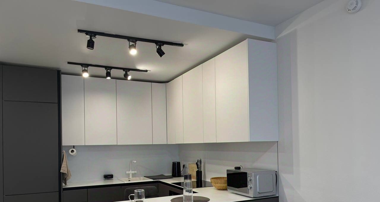 Кухня оснащена всей необходимой техникой: индукционная плита на 4 конфорки, вытяжка, духовка, посудомоечная машина, встроенный холодильник с морозилкой.