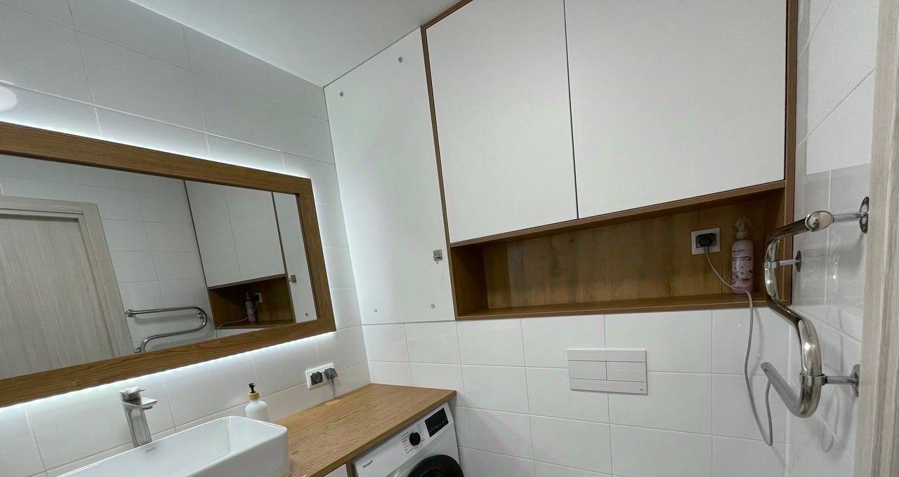 В ванной стиральная машина, экран для ванной, тумба и встроенный в нишу шкаф.