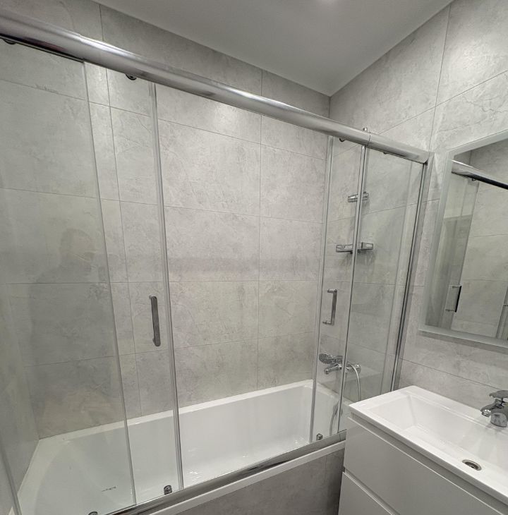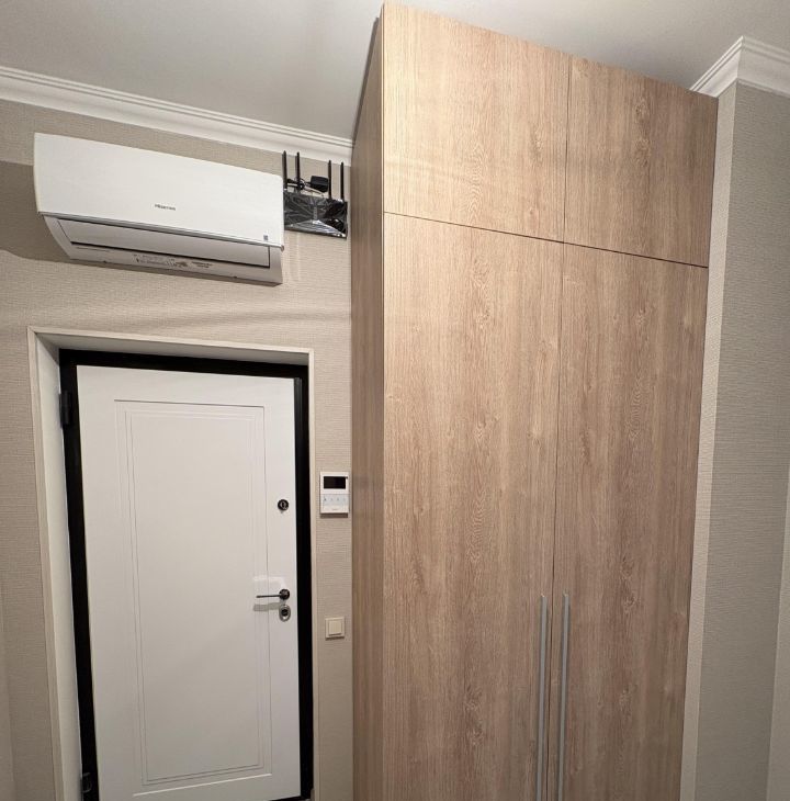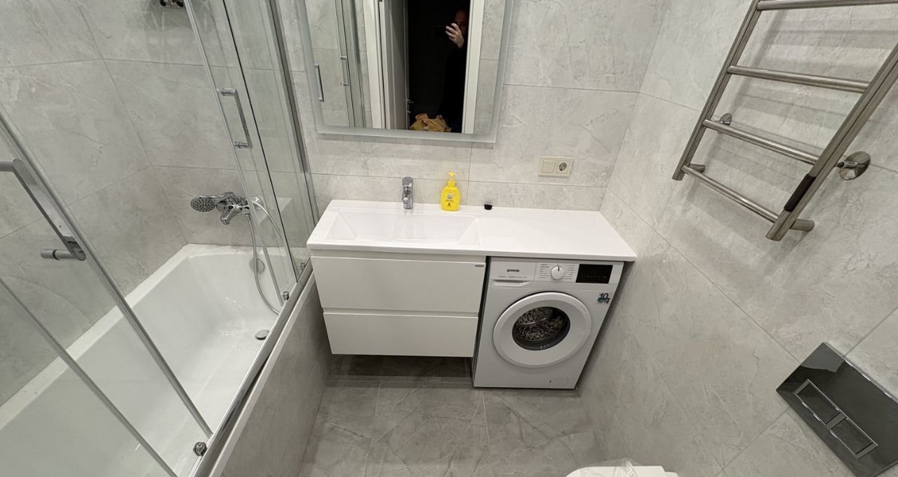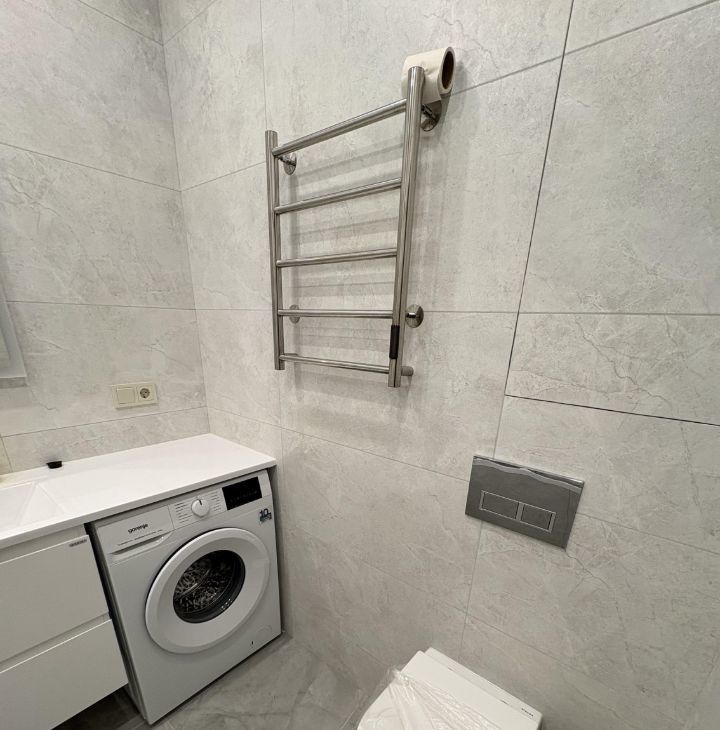Санузел совмещенный, оснащен современной сантехникой и стиральной машиной. В квартире также имеется кондиционер для комфортного проживания в любое время года.