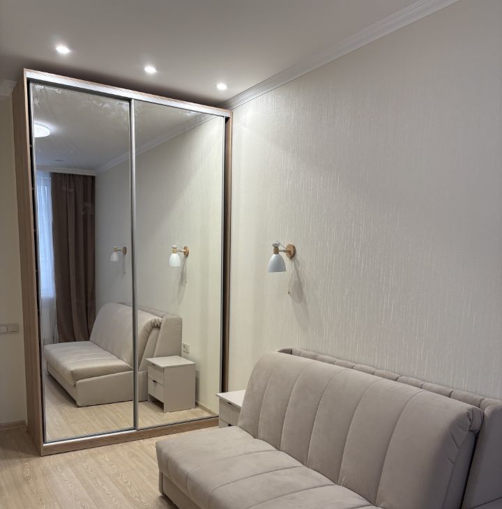 В комнате установлен удобный диван и вместительный шкаф-купе. Лоджия застеклена и утеплена.
