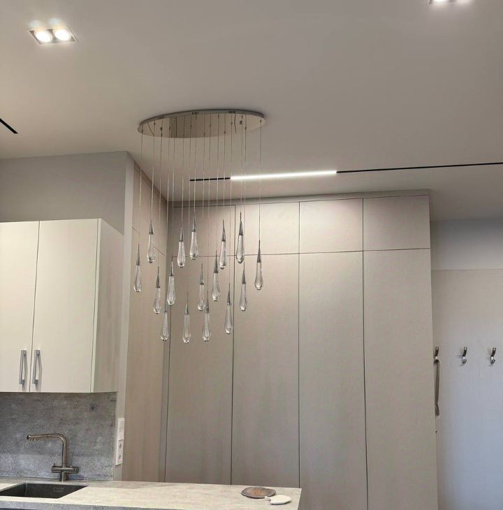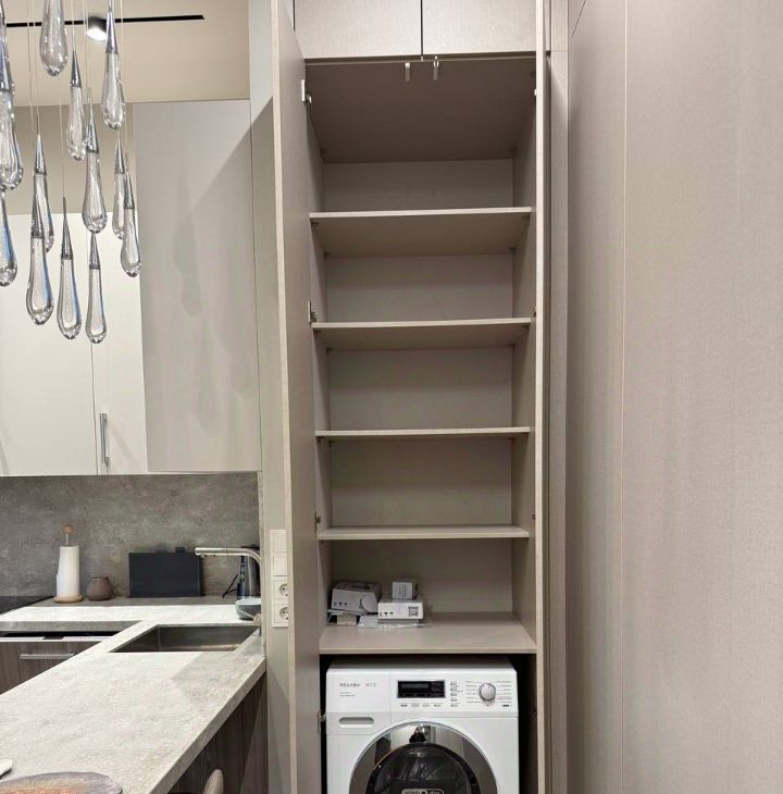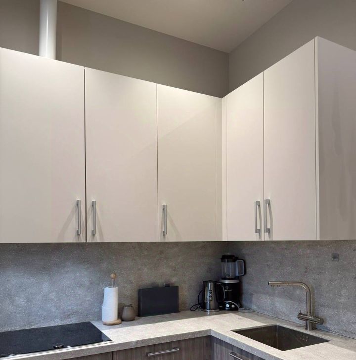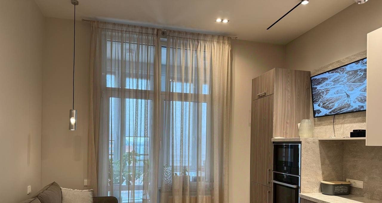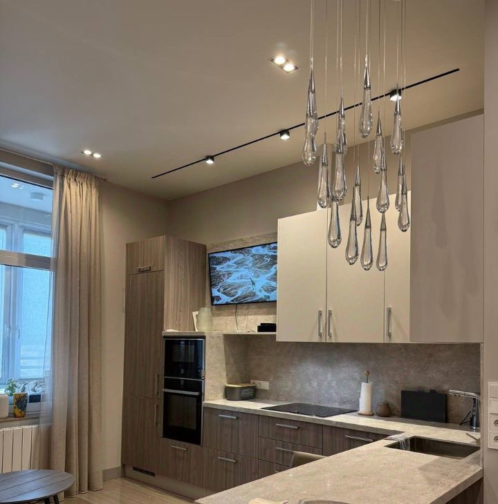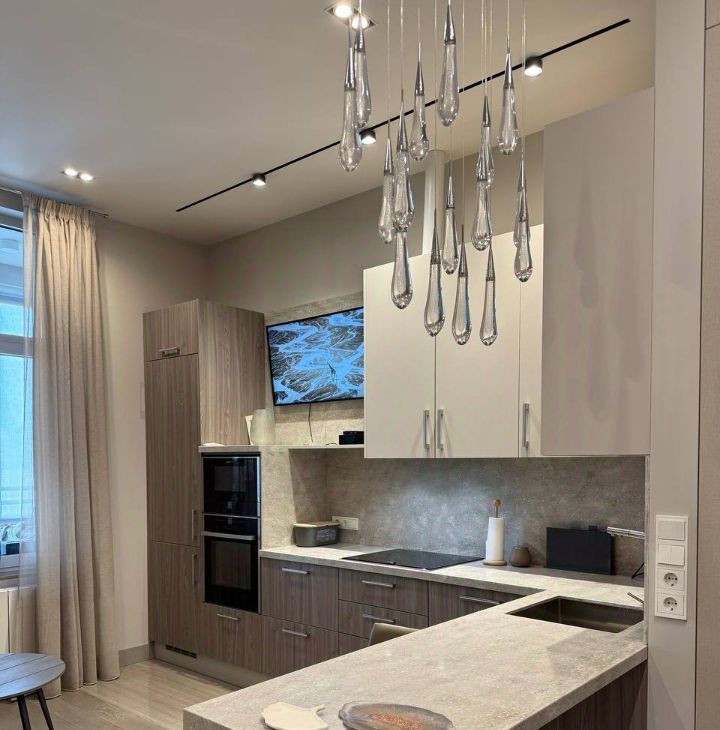 1. Кухня-гостиная с современным кухонным гарнитуром, барной стойкой, встроенной бытовой техникой Neff