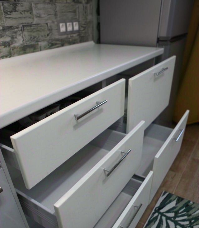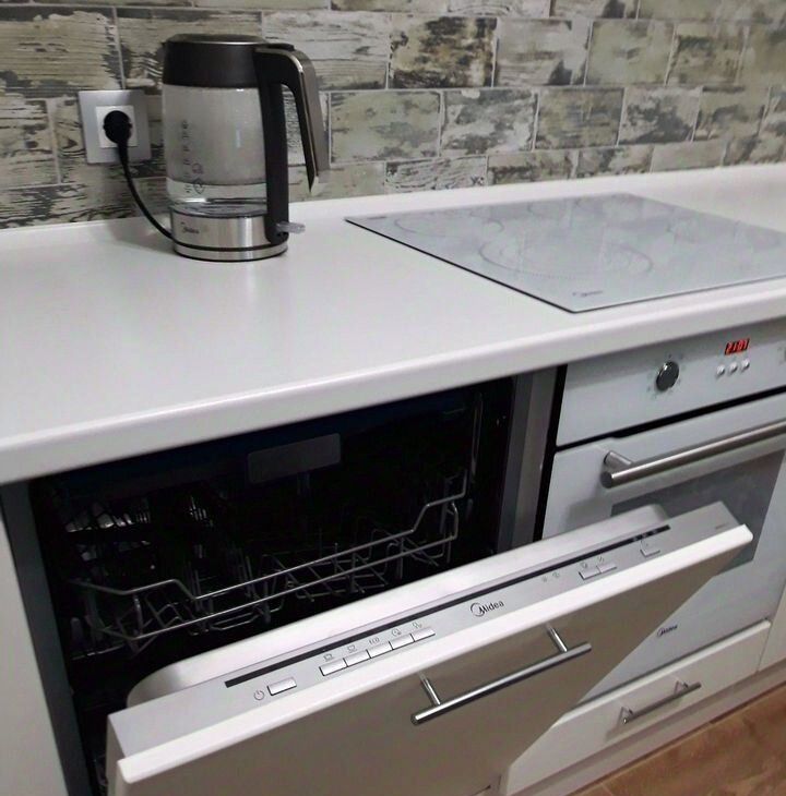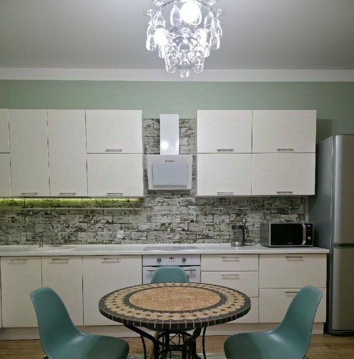 Кухонный гарнитур со встроенной стиральной машиной и посудомойкой, большой холодильник, варочная панель, духовой шкаф, система фильтрации питьевой воды. Санузел с большой душевой кабиной.