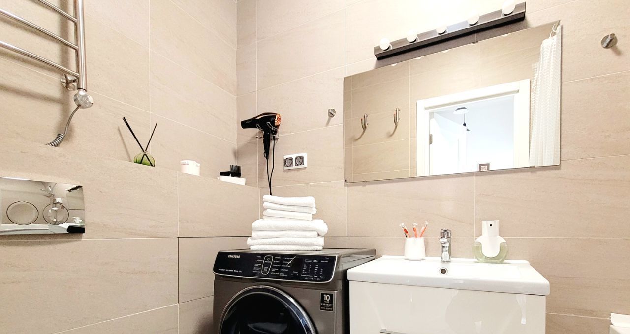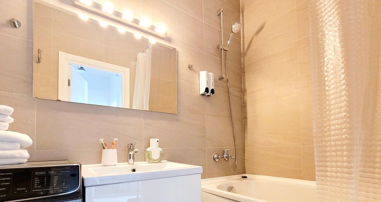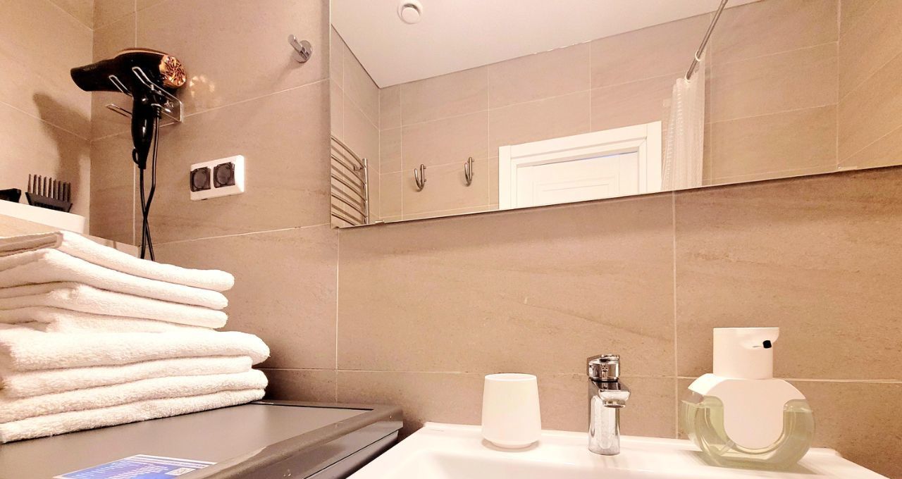 - Ванная, оборудованная стиральной машиной, полотенцесушителем, феном, диспенсерами;