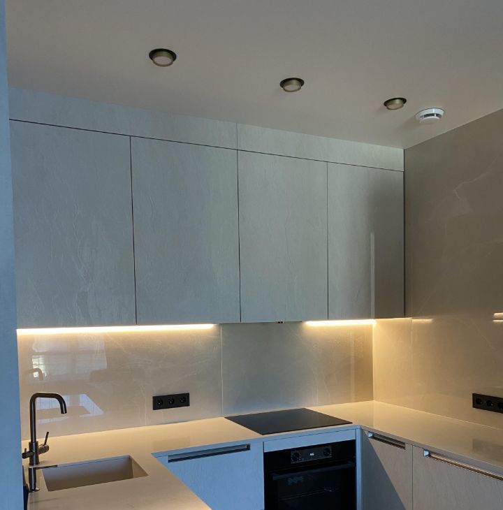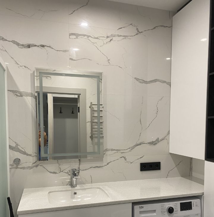 В квартире просторная кухня-гостиная с кухонным гарнитуром Мария и каменной столешницей, есть посудомоечная машина.