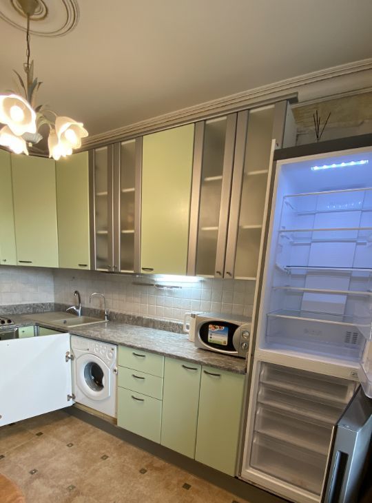 КУХНЯ: пол - плитка с подогревом, встроенный кухонный гарнитур под единой столешницей, газовая варочная панель, духовой шкаф, двухкамерный холодильник (НОУ ФРОСТ), обеденный стол, стулья, стиральная машина встроенная.