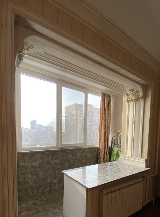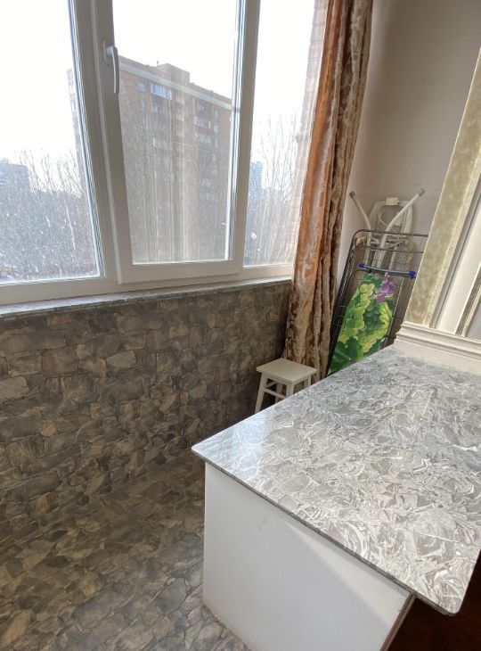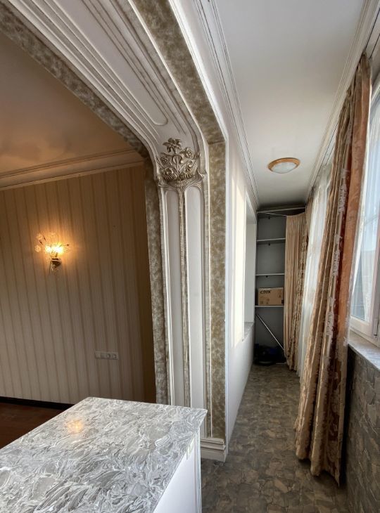 Лоджия со стеклопакетами с антимоскитными сетками, отделана натуральным камнем.