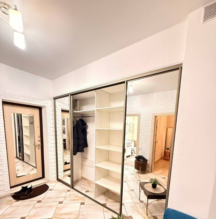 Большой, вместительный зеркальный шкаф-купе в прихожей.