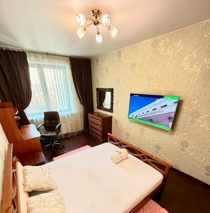 В спальне: Двуспальная кровать. Шкаф. Комод. Рабочий стол с креслом. Телевизор. Кондиционер.