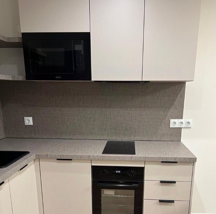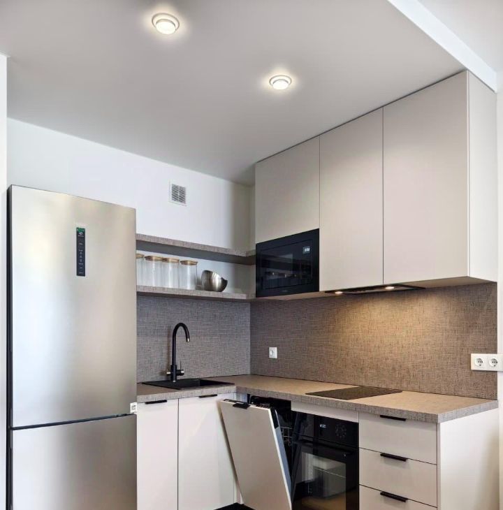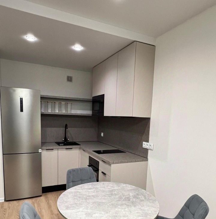 - Кухня фабрики Мария укомплектована встроенной техникой Haier: посудомойкой, СВЧ, индукционной варочной панелью, духовкой, вытяжкой, холодильником, обеденным столом со стульями.