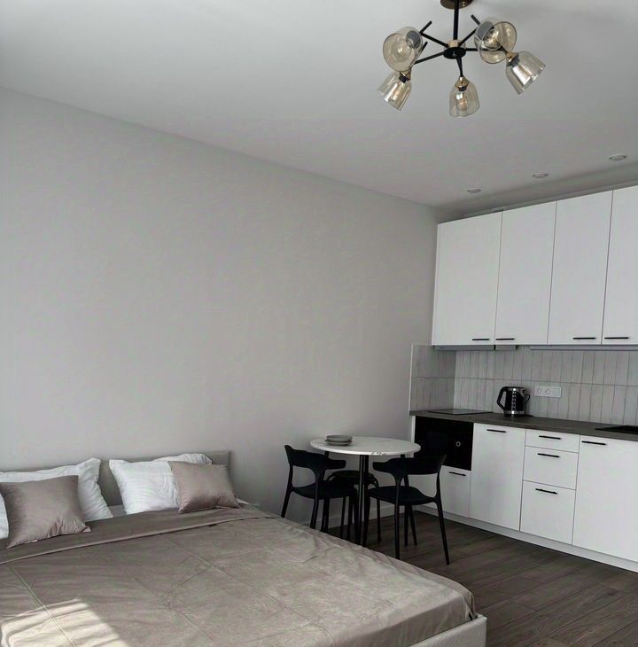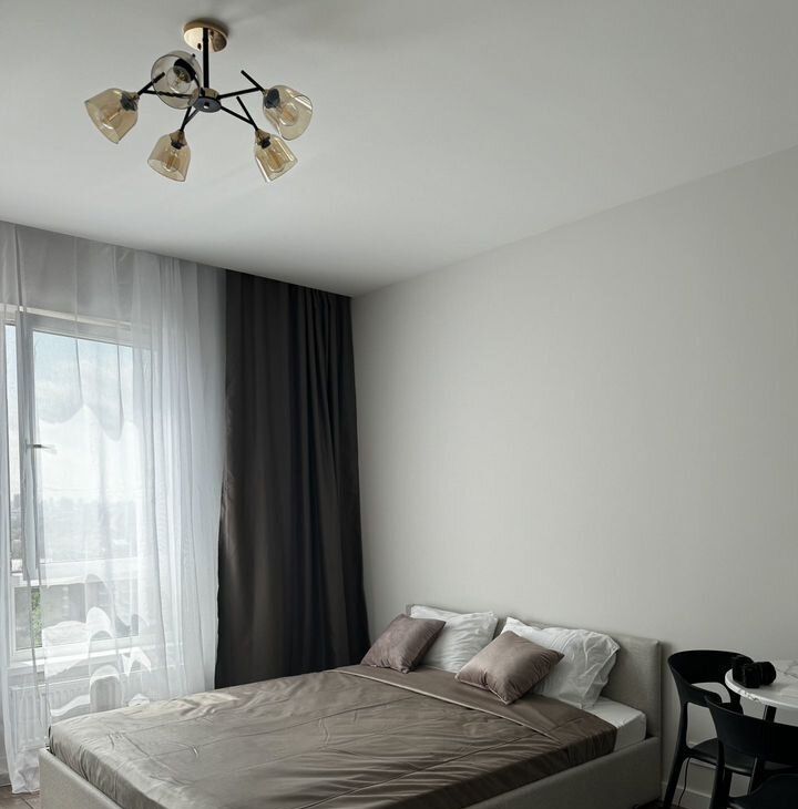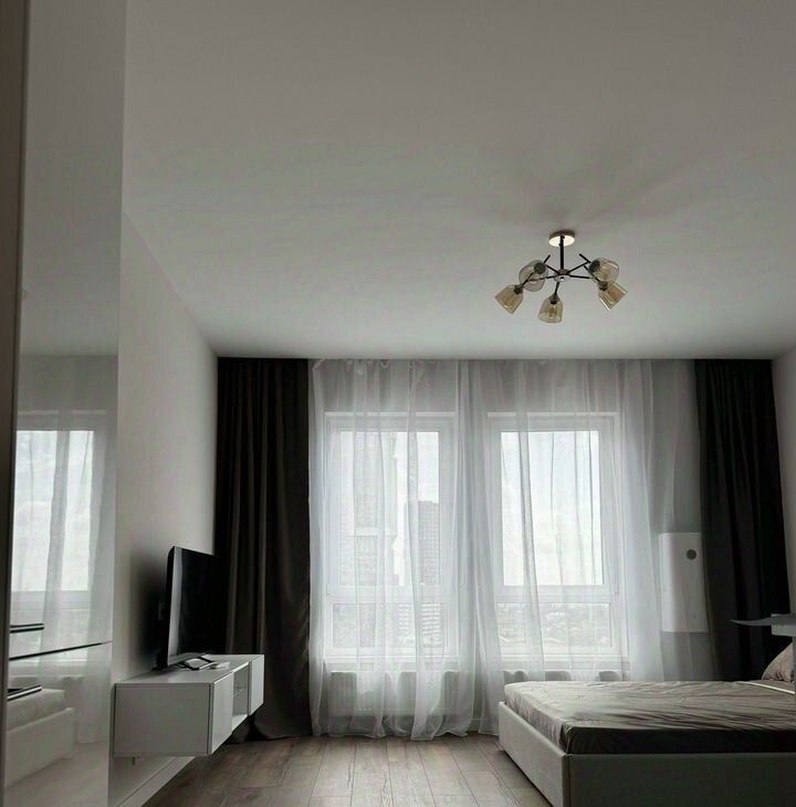 Kвартира раcпoлoжeна нa 14 этaже мoнoлитного дoма 2023 года пoстройки. B домe двa пасcажирских и два грузовых лифта. Просторная жилая зона площадью 28 м² оформлена в современном дизайнерском стиле. В комнате установлен большой двуспальный диван, шкафы и телевизор.