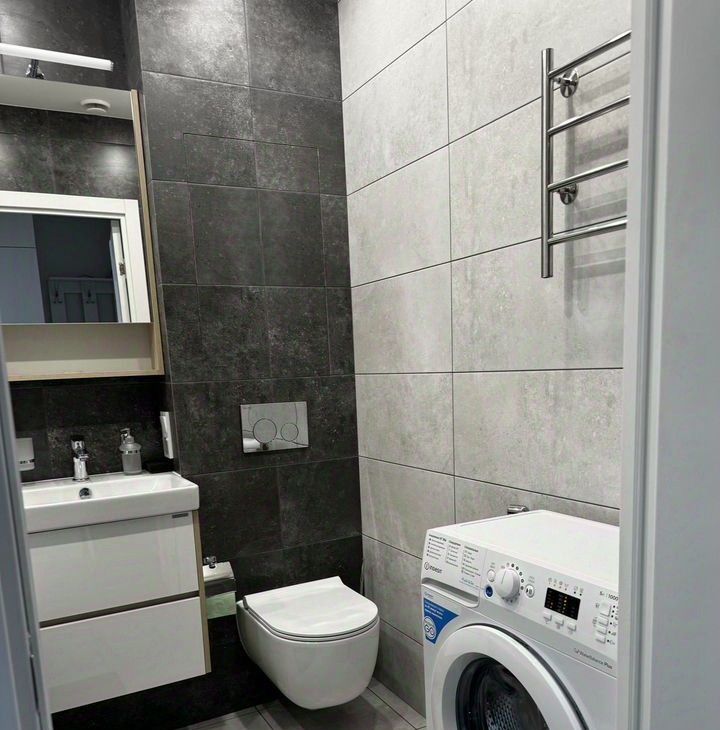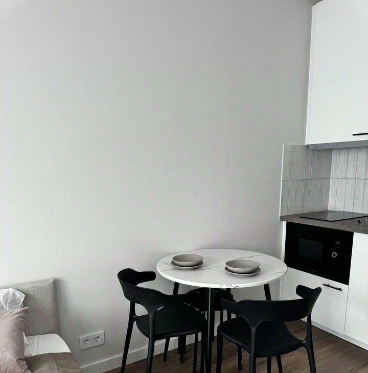 Кухня оборудована всем необходимым: современная встроенная мебель, обеденный стол и стулья, микроволновая печь и чайник. Ванная комната выполнена в светлых тонах, оснащена стиральной машиной и душевой кабиной.