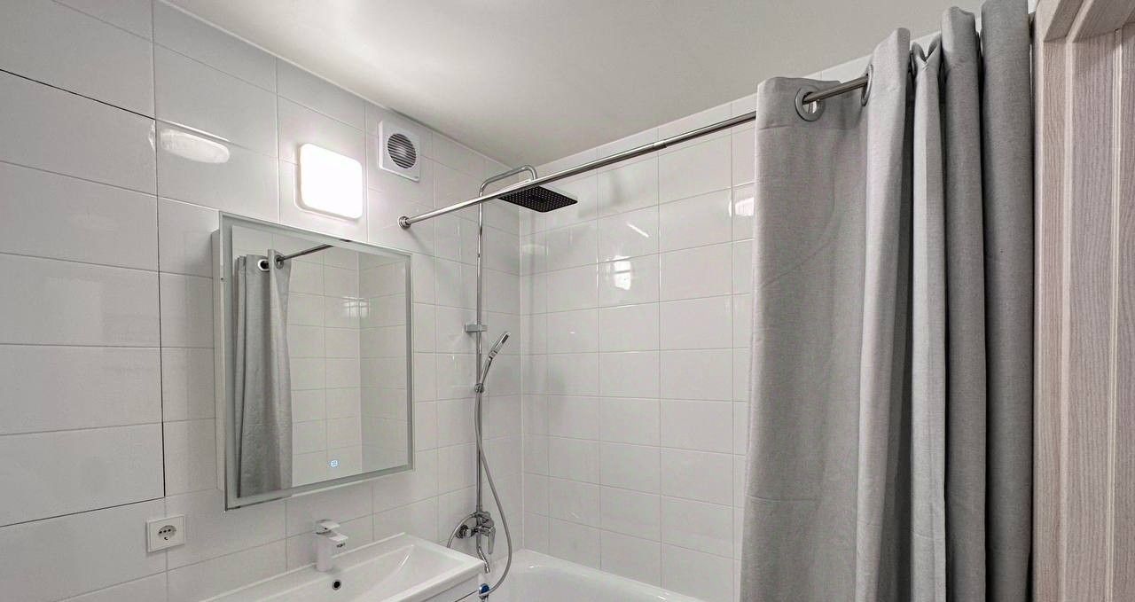 Удобный зеркало - шкафчик с подсветкой, подвесная тумба в ванной, современная душевая стойка.