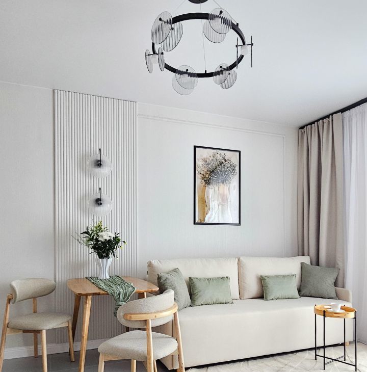 Интерьер выполнен в современном Эко стиле. Продумано много мест хранения.