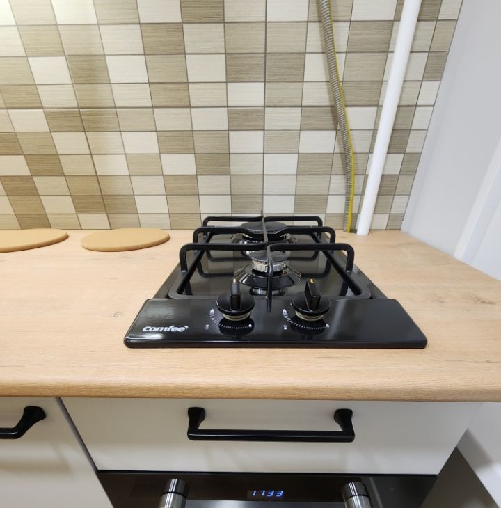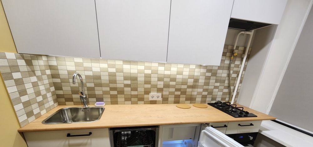 Из бытовой техники: небольшой холодильник, посудомоечная машина, вытяжка с угольным фильтром, плита газовая, духовой шкаф.