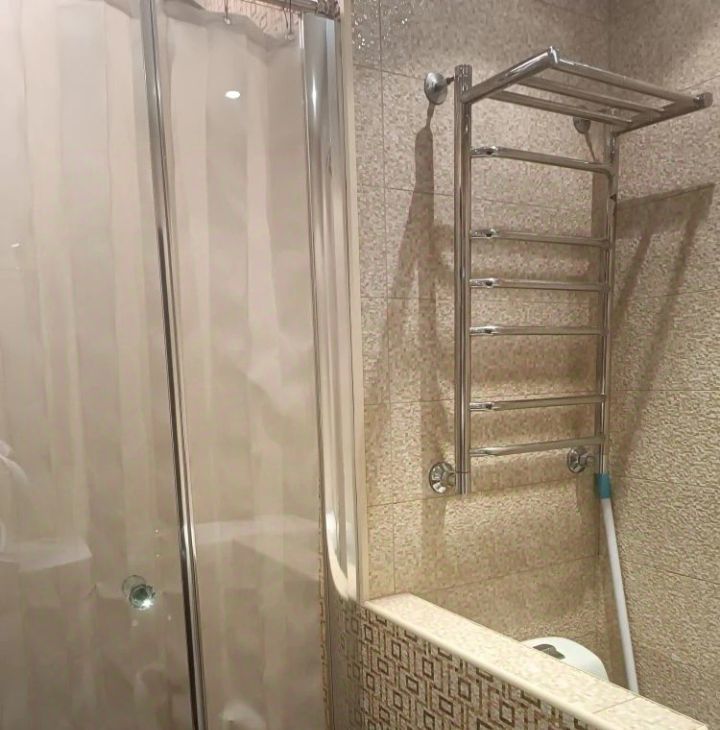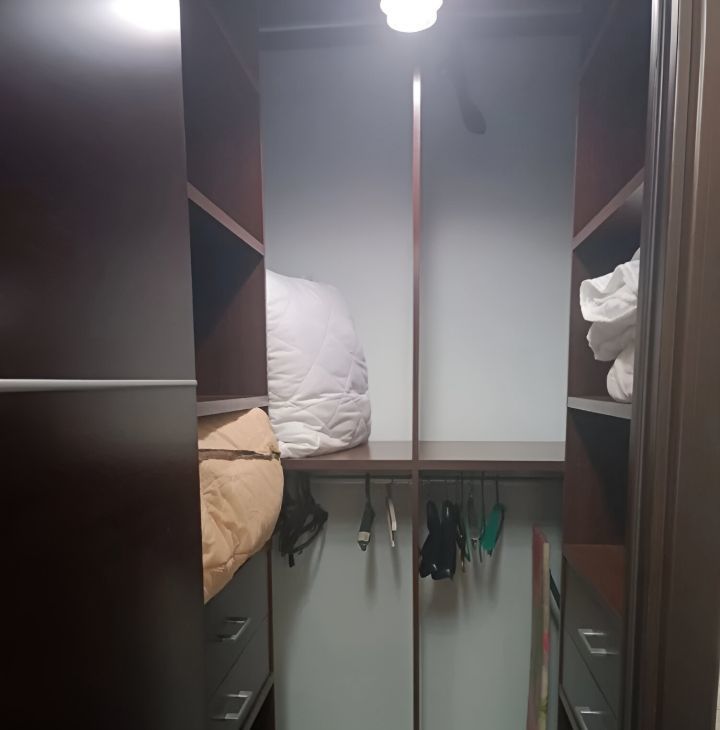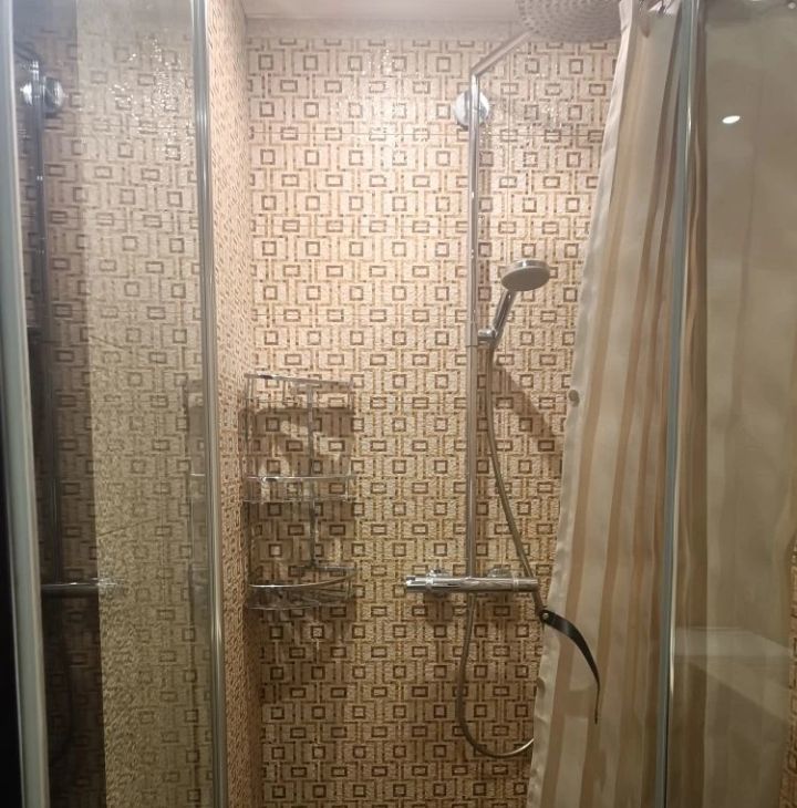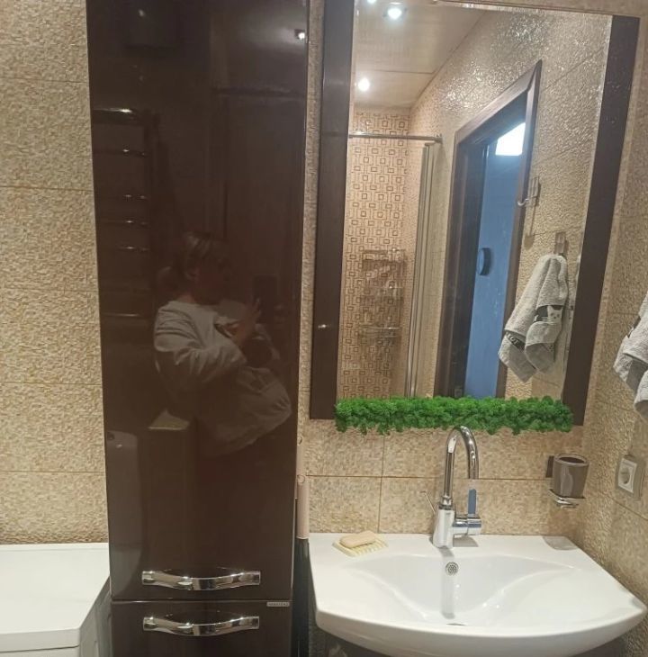- просторный санузел с душевой кабиной, встроенной мебелью для ванной комнаты и стиральной машиной.