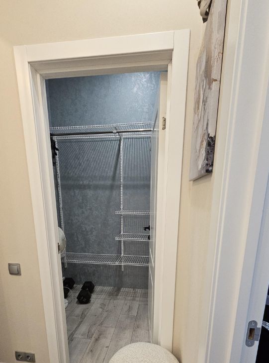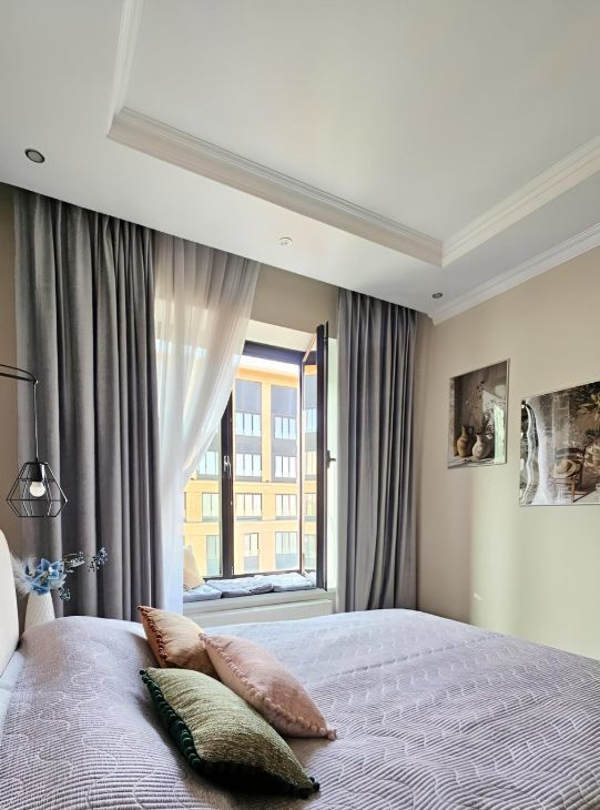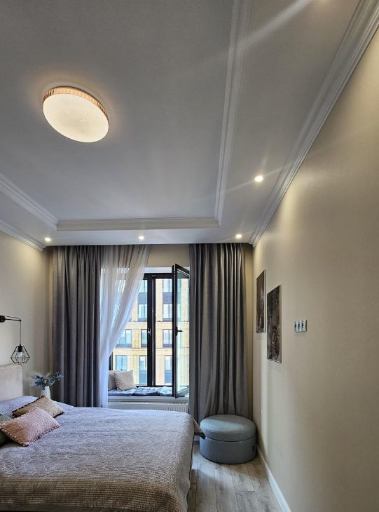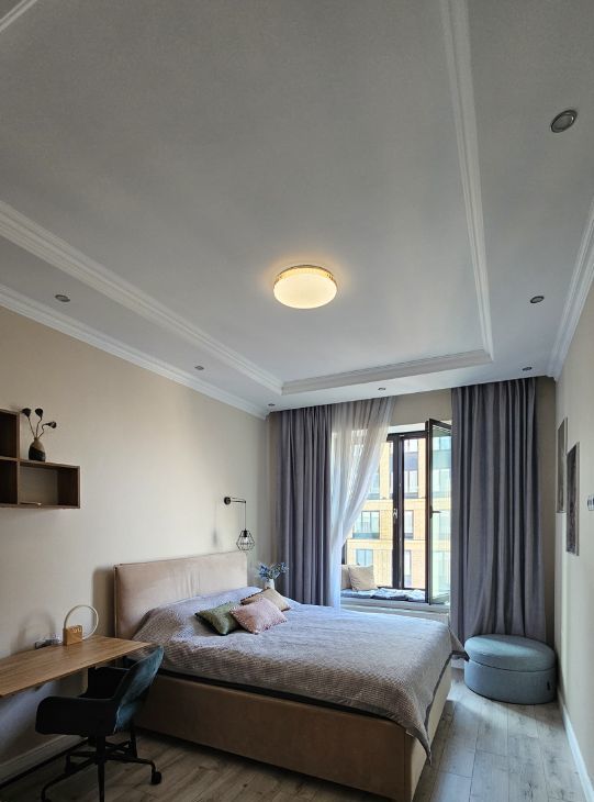 Просторная спальня с рабочей зоной, для гостей есть раскладной диван. Большая кухня, полностью меблированная и оборудованная. С кухни выход на лоджию, на которой можно посидеть. Отдельная гардеробная + просторный шкаф-купе в коридоре.