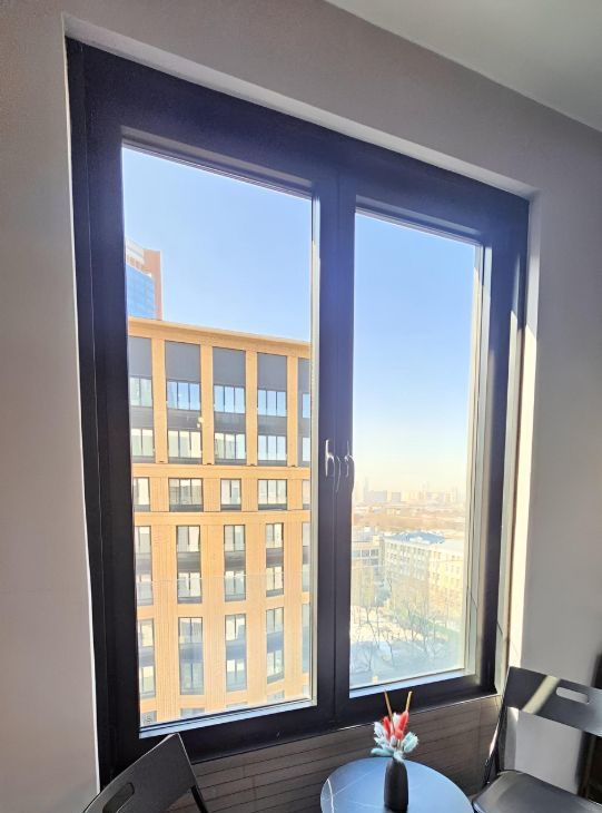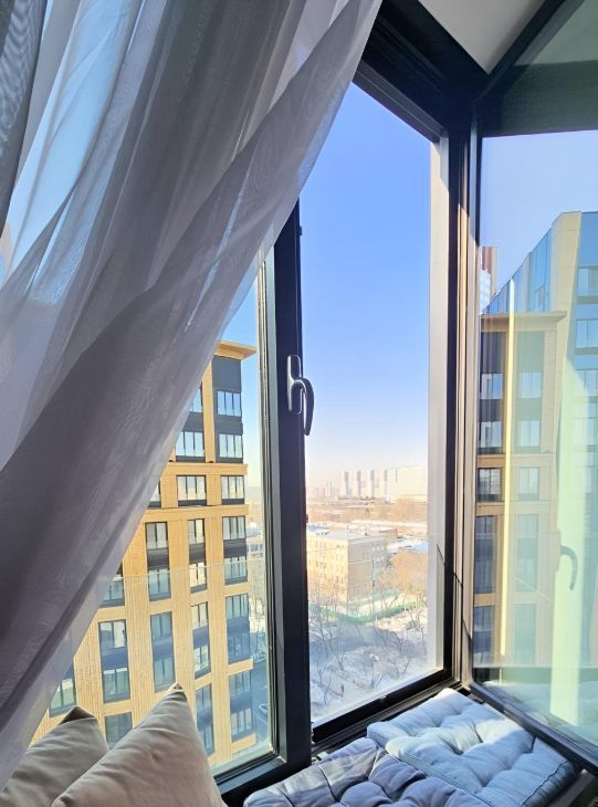 Квартира очень светлая и солнечная, вечером вид на закат. Окна выходят во двор и на не особо проезжую дорогу (не на ТТК), поэтому в квартире тихо.