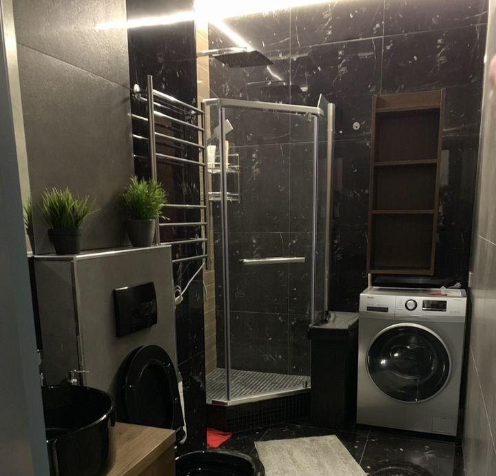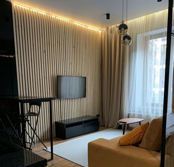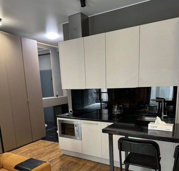 Квартира выполнена в дизайнерском стиле. В просторной комнате и на кухне есть вся необходимая мебель. Кухня площадью 10 кв. м оборудована современной техникой: посудомоечная машина, холодильник и кондиционер. В ванной комнате установлена душевая кабина и стиральная машина. Вся техника и мебель новые и в отличном состоянии, поэтому можно сразу заехать и жить с комфортом.